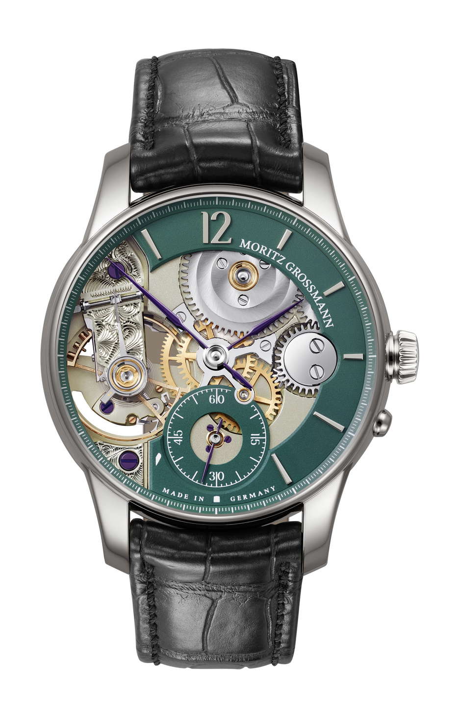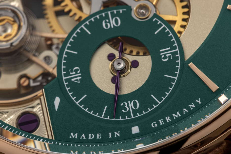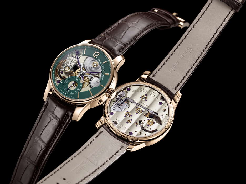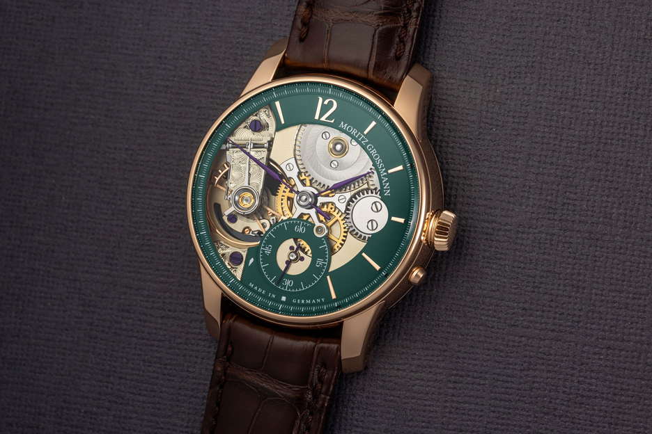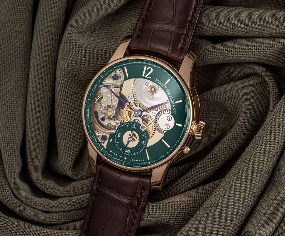 Moritz Grossmann celebrates its 15th anniversary with the release of the BACKPAGE Green, a limited edition watch collection that embodies the legacy and craftsmanship of the Glashütte-based manufactory. This special edition, available in rose gold or platinum, is limited to 25 pieces in each variant. The BACKPAGE Green is distinguished by its innovative design, which reveals the intricacies of its mechanical movement through large dial cutouts. These cutouts showcase the calibre 107.0’s key elements, such as the Grossmann balance and a hand-engraved balance cock, traditionally hidden at the back of the watch. The movement’s mirrored construction presents a unique aesthetic, with the seconds hand mounted in a gold chaton, adding prominence to its display. The watch also features an in-house developed winder with pusher and stop seconds, visible on the back side. The green elements on the dial create a striking contrast against the gold-plated gear wheels, gold chatons, and polished screw heads, highlighting the watch’s sophisticated finish. The handcrafted hands, annealed in a brown-violet hue, add to the watch’s elegance. The BACKPAGE Green is a testament to Moritz Grossmann’s commitment to combining traditional Glashütte watchmaking art with contemporary design and exceptional finishing, marking a significant milestone in the manufactory’s history.