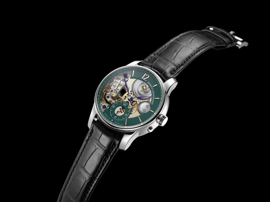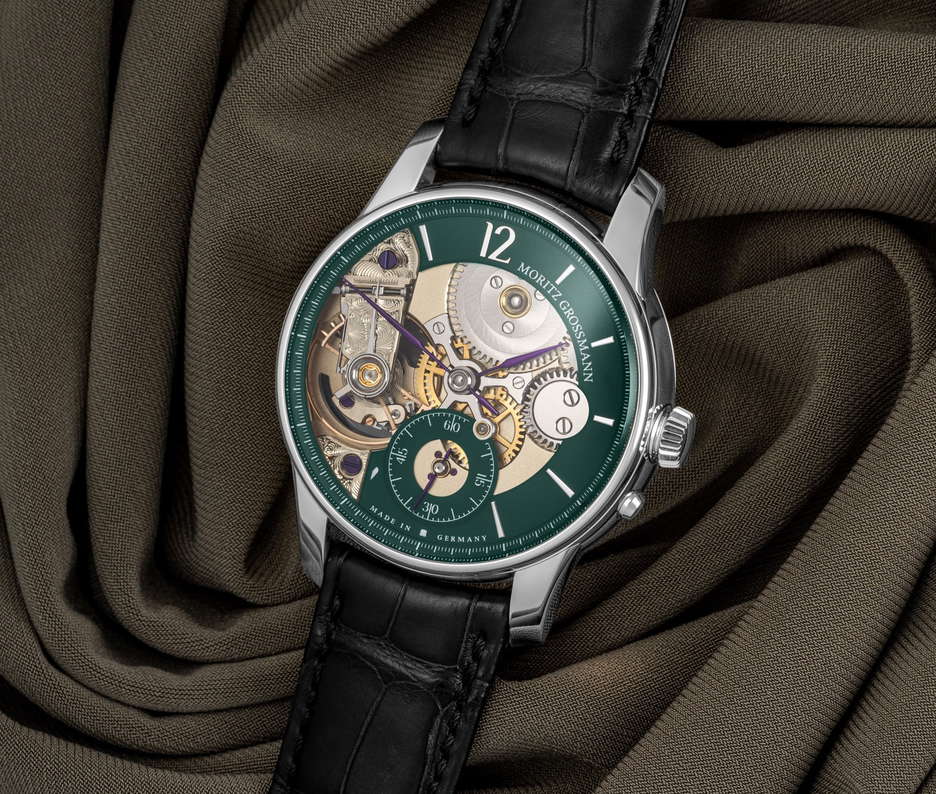 Moritz Grossmann celebrates its 15th anniversary with the release of the BACKPAGE Green, a limited edition watch collection that embodies the legacy and craftsmanship of the Glashütte-based manufactory. This special edition, available in rose gold or platinum, is limited to 25 pieces in each variant. The BACKPAGE Green is distinguished by its innovative design, which reveals the intricacies of its mechanical movement through large dial cutouts. These cutouts showcase the calibre 107.0’s key elements, such as the Grossmann balance and a hand-engraved balance cock, traditionally hidden at the back of the watch. The movement’s mirrored construction presents a unique aesthetic, with the seconds hand mounted in a gold chaton, adding prominence to its display. The watch also features an in-house developed winder with pusher and stop seconds, visible on the back side. The green elements on the dial create a striking contrast against the gold-plated gear wheels, gold chatons, and polished screw heads, highlighting the watch’s sophisticated finish. The handcrafted hands, annealed in a brown-violet hue, add to the watch’s elegance. The BACKPAGE Green is a testament to Moritz Grossmann’s commitment to combining traditional Glashütte watchmaking art with contemporary design and exceptional finishing, marking a significant milestone in the manufactory’s history.