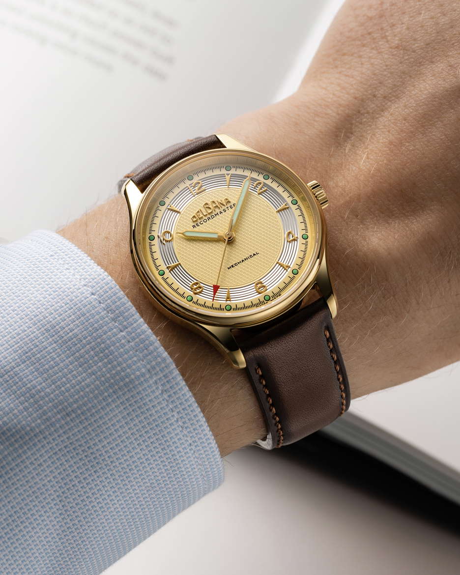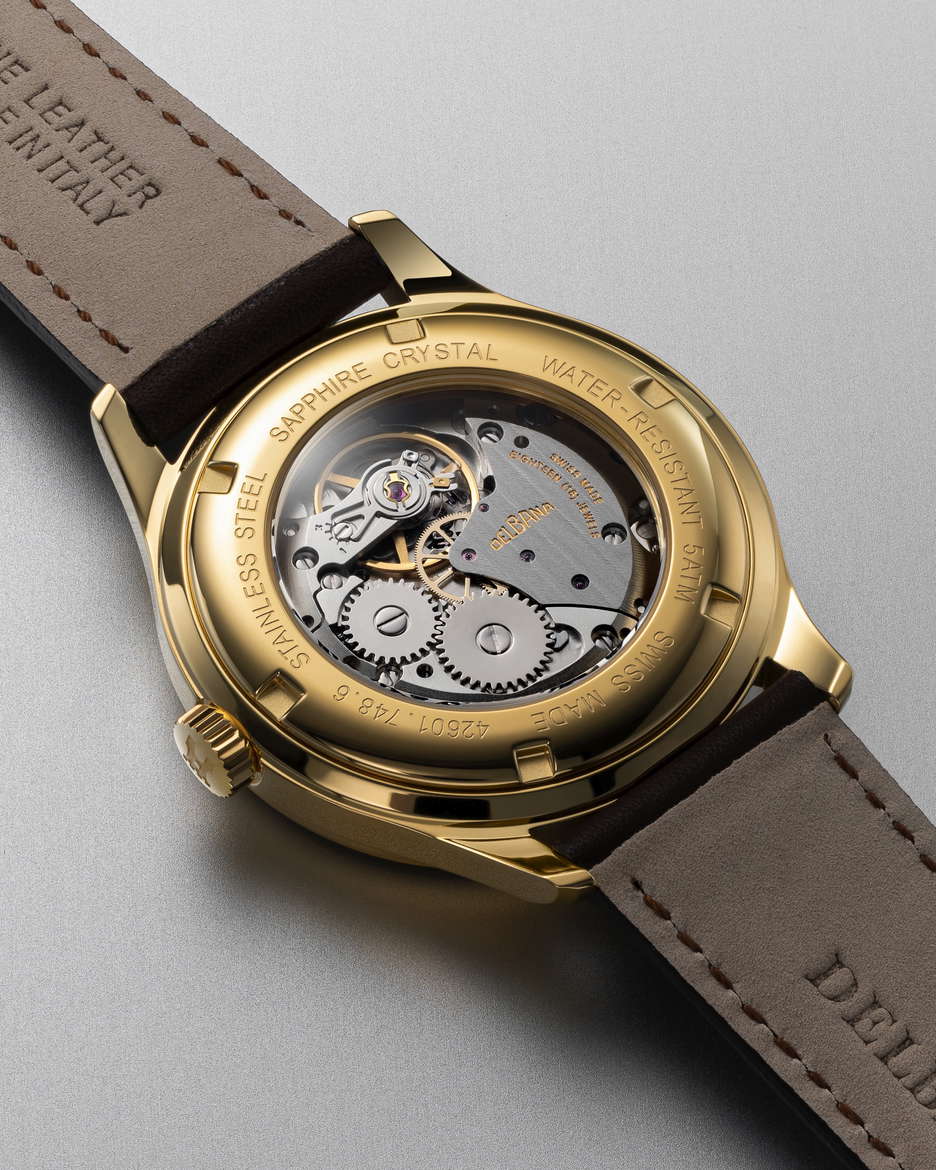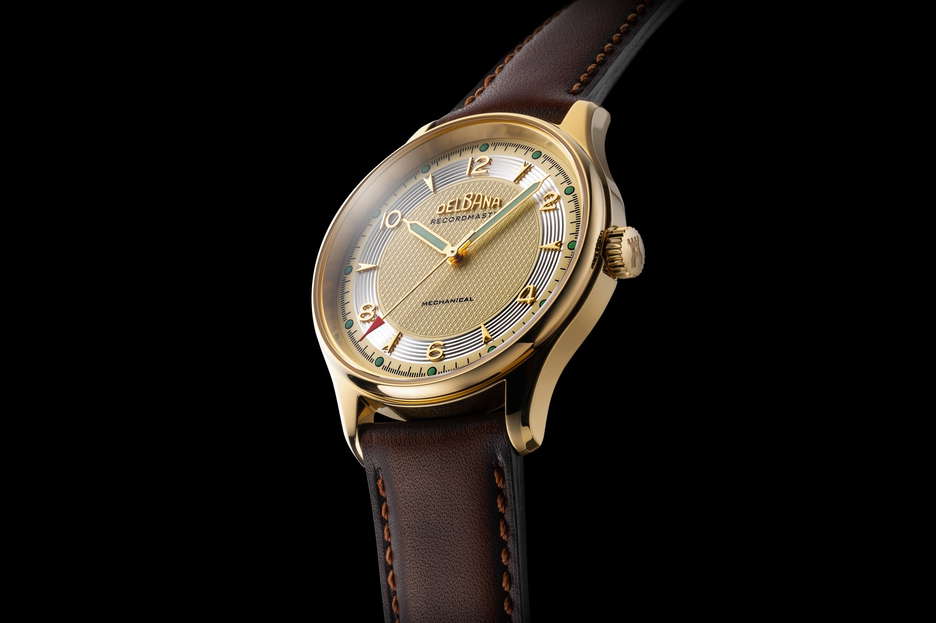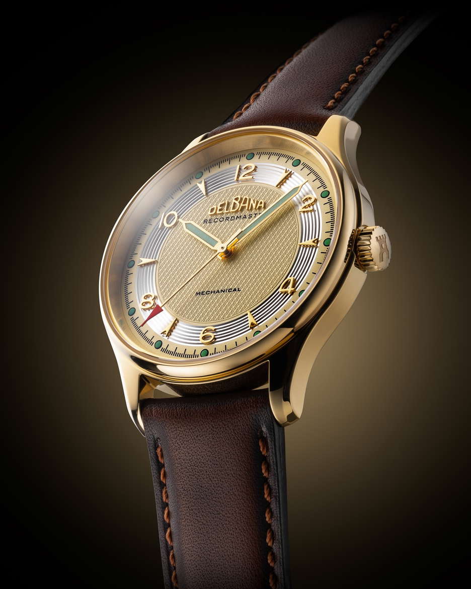 The Delbana Recordmaster Mechanical watch underscores the company’s enduring dedication to mechanical timepieces while honoring their rich 90-year history in watchmaking. The Recordmaster Mechanical seamlessly merges classic performance with a modern aesthetic. This timepiece pays homage to the original 1950s model and the milestone Recordmaster I while incorporating novel elements to give it a revitalized appearance. One of its most notable features is the manual winding movement. This characteristic encourages wearers to connect tactilely with their watch, evoking a simpler era when wristwatches were indispensable, devoid of digital technology. The absence of a date window and the slim 10.8 mm case serve as subtle references to the original vintage design. The watch’s applied arrowhead indexes and vintage Arabic numerals complement the yellow-gold PVD case, creating an elegant and timeless look. The dial of the Recordmaster Mechanical features a minute track with oversized circular luminous hour markers that encircle the watch’s distinctive stepped microgrooves. The minute and hour hands are luminescent, while a striking red central seconds hand imparts a vintage and classic touch. The transparent case back allows users to admire the unmistakable quality of a Swiss-Made mechanical timepiece, revealing the SW210-1 hand-winding movement. The latest collection of Recordmaster Mechanical watches is available in a classic silver dial with black engraved grooves or a reverse black dial with silver grooves. Furthermore, the new line introduces neutral color combinations like champagne and copper, paired with silver or black grooves that frame the intricately designed central guilloche pattern on the dial. The watch’s refined design and handcrafted Italian leather strap in brown or black complement the celebration of affordable luxury.