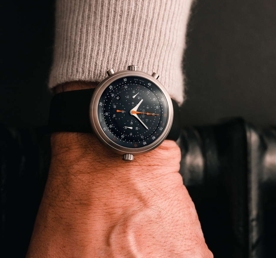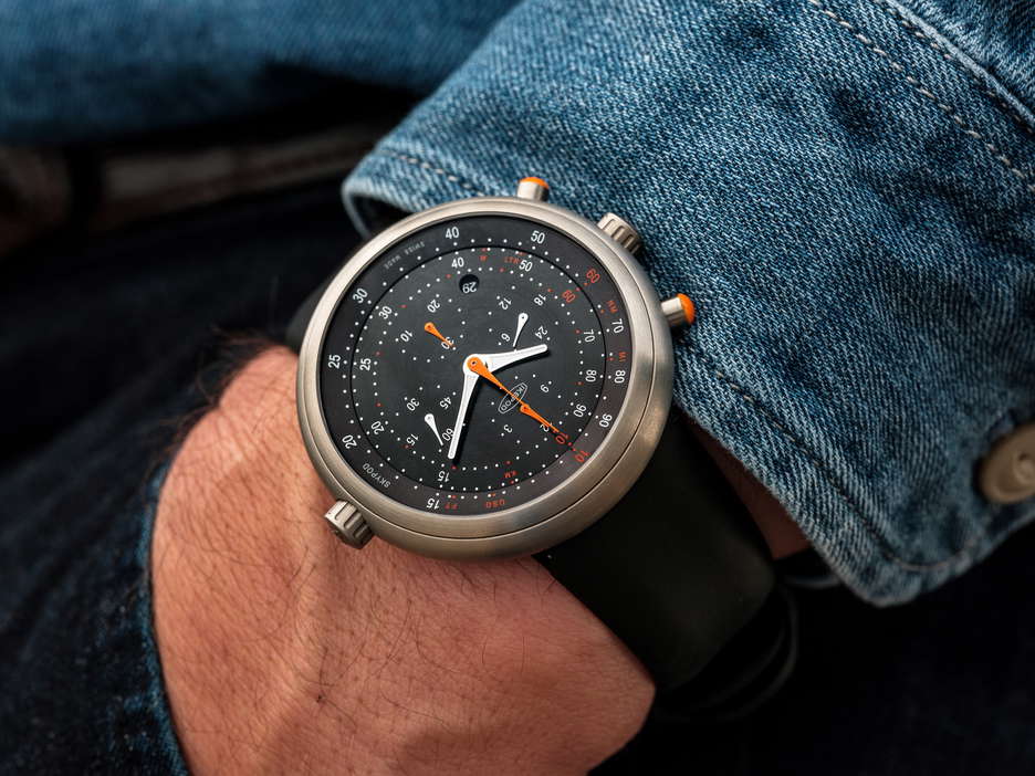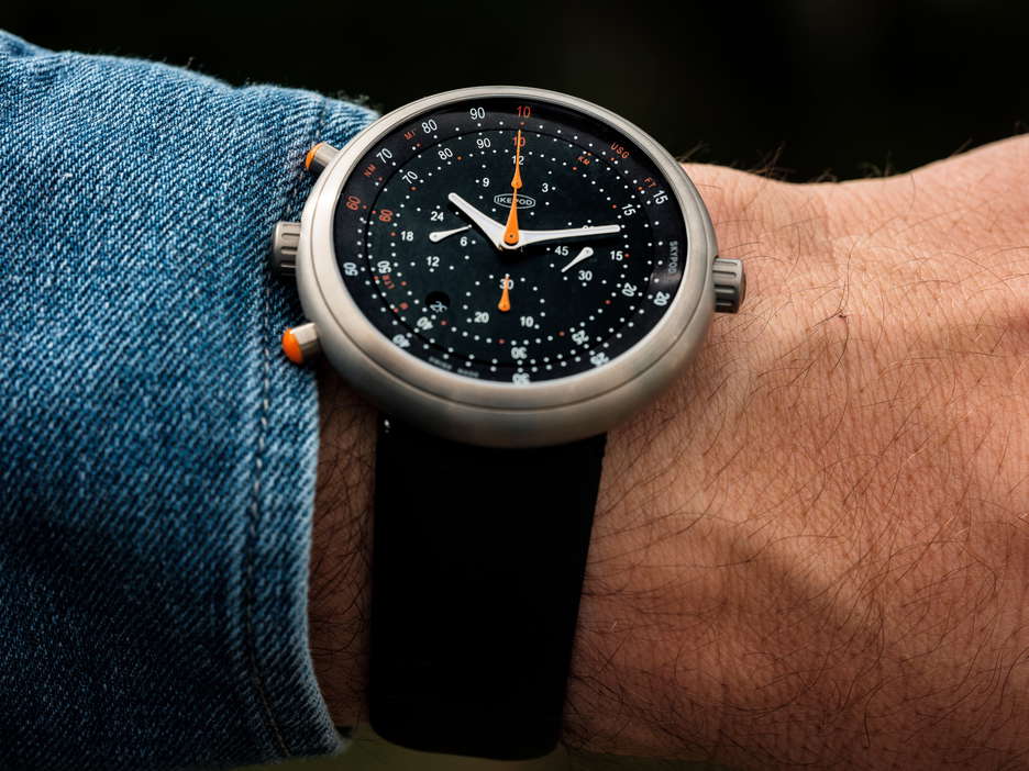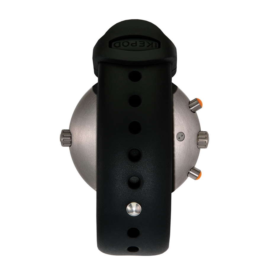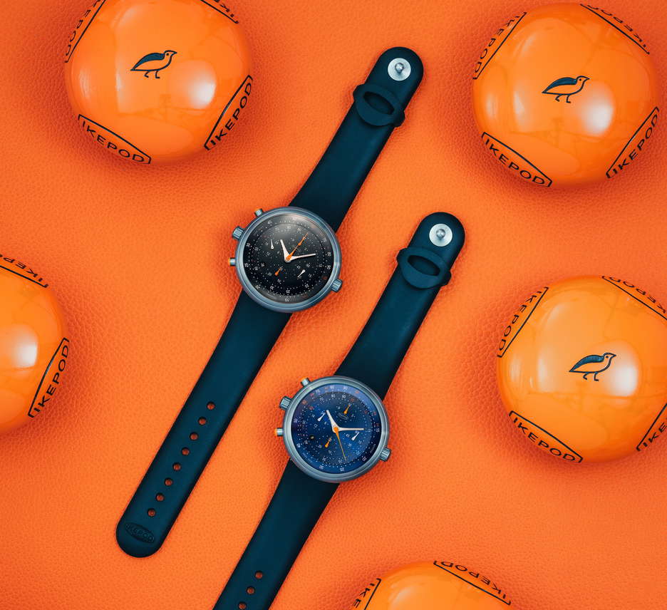The Ikepod Skypod is a limited edition revival of the classic Ikepod Megapode Chronograph. It features updated components, including new-old-stock movements originally used in the Megapode. The watch’s size has been slightly reduced, with a 46mm titanium case replacing the original 47mm stainless steel one, maintaining its smooth shape. Despite its large size on paper, its design without external lugs and a 43mm lug-to-lug dimension makes it extremely comfortable to wear. The watch is protected by a domed sapphire crystal on top and a porthole sapphire crystal on the back, reminiscent of early Ikepod designs. It has various functional elements like crowns and pushers for operating the watch and its chronograph features. The dials, redesigned by Stockholm-based studio Claesson Koivisto Rune, capture the essence of the original Megapode but with a modern twist. Available in brown, black, or blue, the dials have a circular brushed finish with white and orange details. The Ikepod signature-shaped hands display time and chronograph functions, including a second-time zone. The heart of the watch, the LJP 8103 movement, is sourced from unused stock from the Megapode Chronograph era and has been fully serviced to function like new. They offer a 28,800vph frequency and approximately 40 hours of running time, visible through the caseback. Finally, the Ikepod Skypod is fitted with a newly designed rubber strap that integrates seamlessly into the case, secured with a metal stud and keeper. This model is a highly exclusive release, with only 25 pieces available in each color variant.