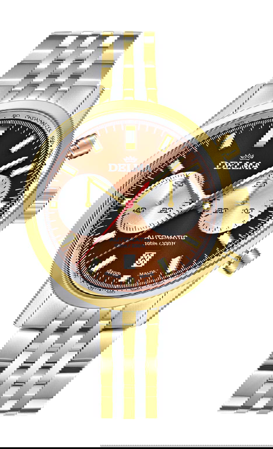 The Continental Automatic is characterized by clear contours and the contrast of the brushed and polished stainless steel and yellow gold plated case, evoking the classic flair of the 1960s with a sporty twist. Its sophisticated brown sunray dial beautifully harmonizes with the silver guilloche sub-dials. The indices, date feature at 6 o’clock, and a standout red seconds hand enhance its ageless appeal. The iconic crown, pushers, and the alternating brushed and polished 7-link bracelet enhance its luxurious yet relaxed style. The watch’s Sellita SW510 automatic movement, adorned with a DELMA inscribed rotor, is visible through the see-through case back.