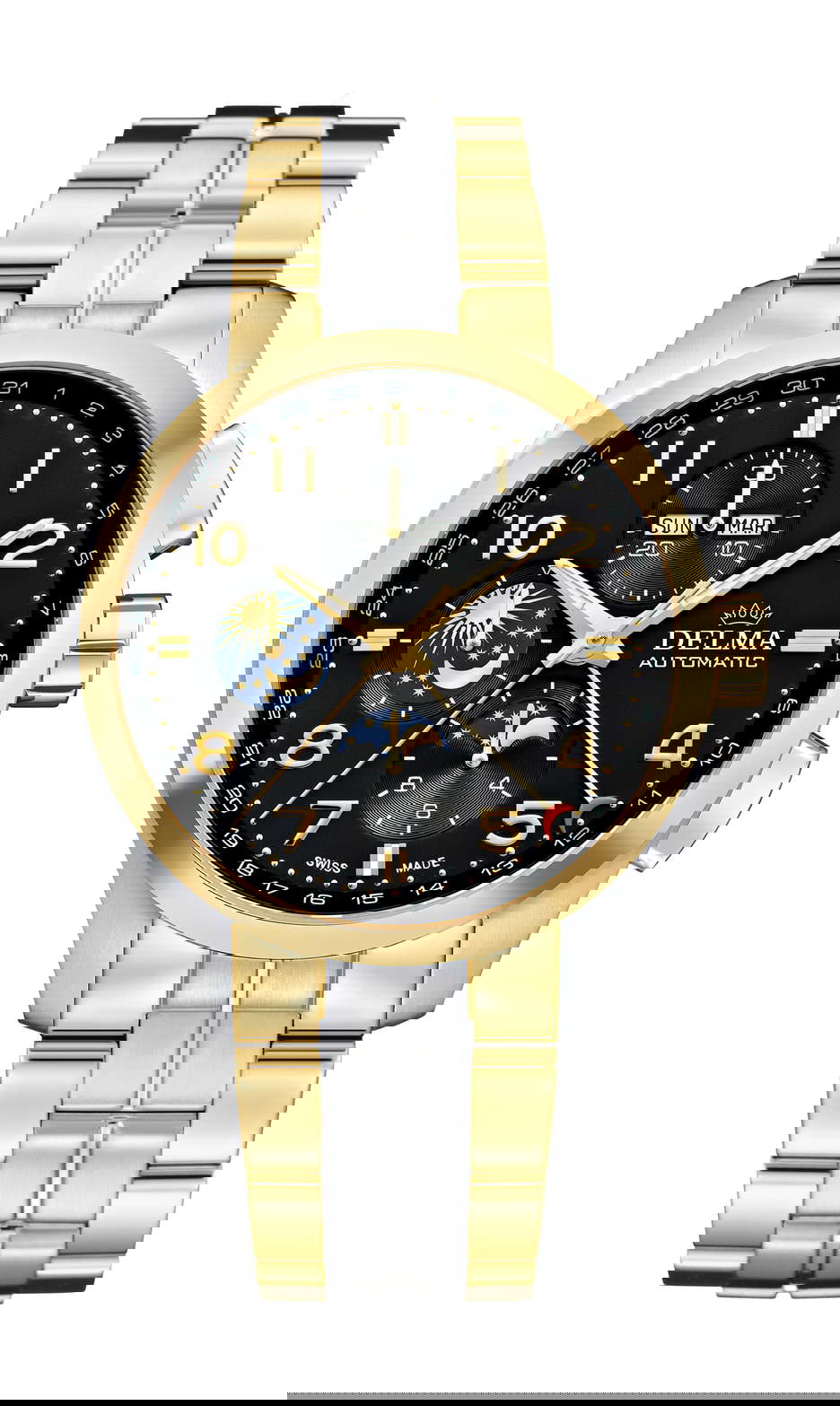 Delve into the celestial beauty and intricacy of DELMA’s Klondike Moonphase watch, which is celebrated for its meticulous craftsmanship and stellar elegance. At the heart of this timepiece is a day-and-night indicator. Here, a shimmering golden sun illuminates the daytime, while a night sky strewn with gleaming gold stars signifies the nocturnal hours. This revolving disk paints a vivid portrayal of the earth’s 24-hour rotation in all its magnificence. The golden moon phase indicator is perfectly positioned beneath the chronograph’s hour counter, adding a touch of sophistication. In harmony with the lunar motif, the date is distinctly pointed out by a crescent-tipped hand, intertwining functionality with thematic brilliance. The timepiece’s classic black dial not only provides a pristine backdrop for these astronomical displays but also magnificently exhibits a myriad of complications. This is gracefully encased in a two-tone stainless-steel exterior that seamlessly merges with a matching bracelet. Practicality meets finesse with features such as the 30-minute and 12-hour counters, ideal for timing races, and a conveniently located day-date display at 3 o’clock, ensuring the passage of time is always within one’s grasp. The transparent case back invites watch lovers to marvel at the intricate inner workings of this masterful creation. The automatic movement is adorned with blued screws, exuding elegance at every turn. Moreover, the rotor is decorated with a refined Côtes de Genève finish. A testament to unparalleled quality, the rotor also boasts an engraving of the DELMA logo, underscoring the brand’s esteemed legacy in the world of horology.