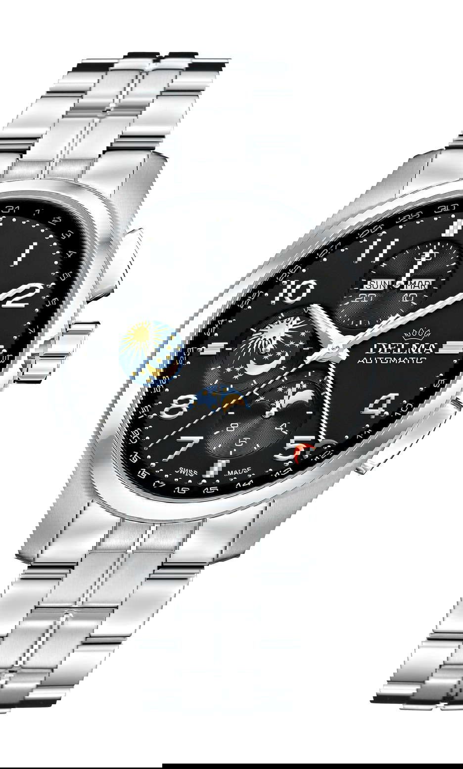 Delve into the celestial beauty and intricacy of DELMA’s Klondike Moonphase watch, which is celebrated for its meticulous craftsmanship and stellar elegance. At the heart of this timepiece is a day-and-night indicator. Here, a shimmering golden sun illuminates the daytime, while a night sky strewn with gleaming gold stars signifies the nocturnal hours. This revolving disk paints a vivid portrayal of the earth’s 24-hour rotation in all its magnificence. The golden moon phase indicator is perfectly positioned beneath the chronograph’s hour counter, adding a touch of sophistication. In harmony with the lunar motif, the date is distinctly pointed out by a crescent-tipped hand, intertwining functionality with thematic brilliance. The timepiece’s classic black dial not only provides a pristine backdrop for these astronomical displays but also magnificently exhibits a myriad of complications. This is gracefully encased in a stainless-steel case that seamlessly merges with a matching bracelet. Practicality meets finesse with features such as the 30-minute and 12-hour counters, ideal for timing races, and a conveniently located day-date display at 3 o’clock, ensuring the passage of time is always within one’s grasp. The transparent case back invites watch lovers to marvel at the intricate inner workings of this masterful creation. The automatic movement is adorned with blued screws, exuding elegance at every turn. Moreover, the rotor is decorated with a refined Côtes de Genève finish. A testament to unparalleled quality, the rotor also boasts an engraving of the DELMA logo, underscoring the brand’s esteemed legacy in the world of horology.
