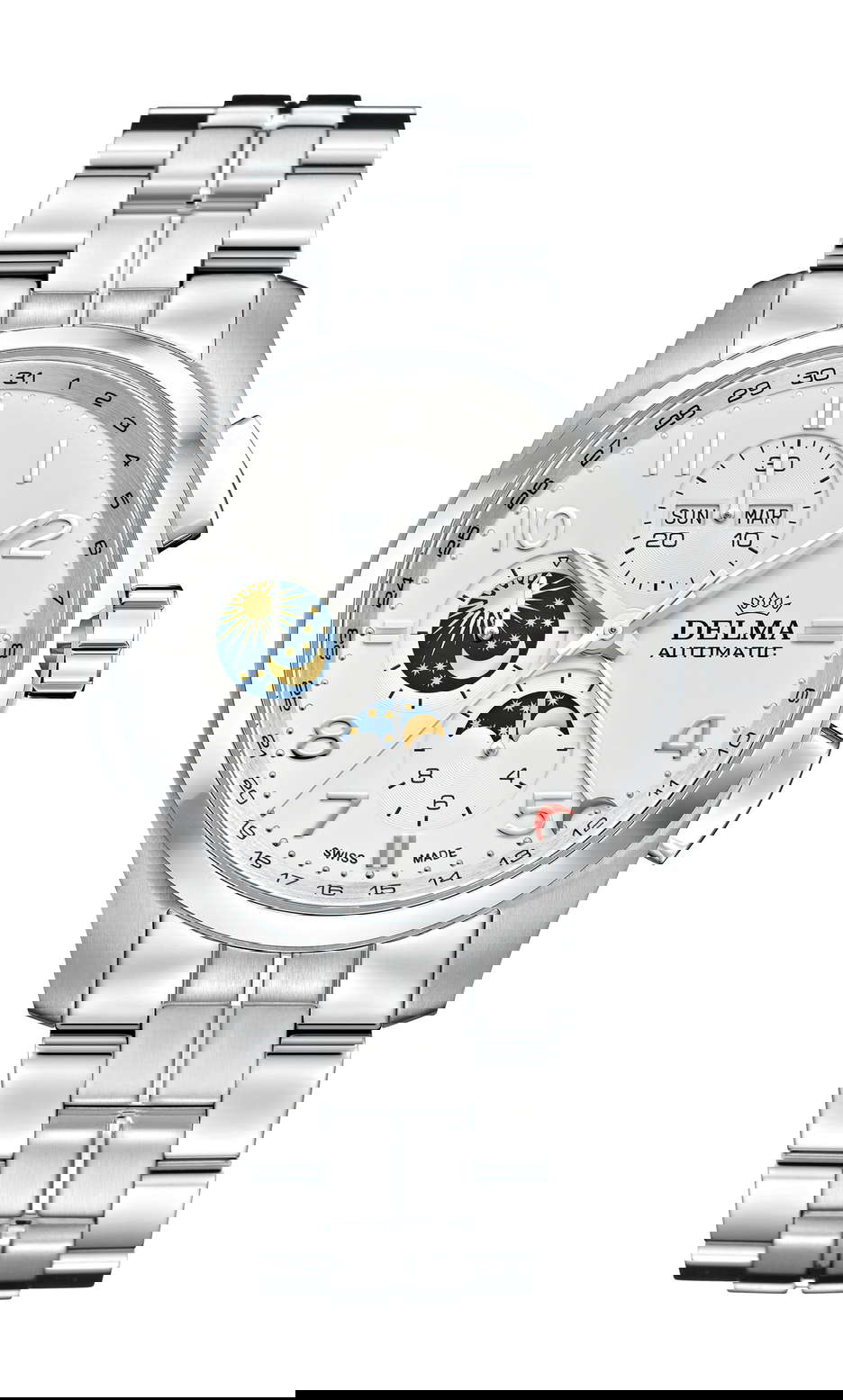 Delve into the celestial beauty and intricacy of DELMA’s Klondike Moonphase watch, which is celebrated for its meticulous craftsmanship and stellar elegance. At the heart of this timepiece is a day-and-night indicator. Here, a shimmering golden sun illuminates the daytime, while a night sky strewn with gleaming gold stars signifies the nocturnal hours. This revolving disk paints a vivid portrayal of the earth’s 24-hour rotation in all its magnificence. The golden moon phase indicator is perfectly positioned beneath the chronograph’s hour counter, adding a touch of sophistication. In harmony with the lunar motif, the date is distinctly pointed out by a crescent-tipped hand, intertwining functionality with thematic brilliance. The timepiece’s classic white dial not only provides a pristine backdrop for these astronomical displays but also magnificently exhibits a myriad of complications. This is gracefully encased in a stainless-steel case that seamlessly merges with a matching bracelet. Practicality meets finesse with features such as the 30-minute and 12-hour counters, ideal for timing races, and a conveniently located day-date display at 3 o’clock, ensuring the passage of time is always within one’s grasp. The transparent case back invites watch lovers to marvel at the intricate inner workings of this masterful creation. The automatic movement is adorned with blued screws, exuding elegance at every turn. Moreover, the rotor is decorated with a refined Côtes de Genève finish. A testament to unparalleled quality, the rotor also boasts an engraving of the DELMA logo, underscoring the brand’s esteemed legacy in the world of horology.