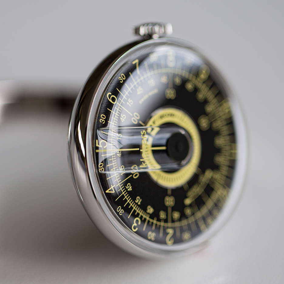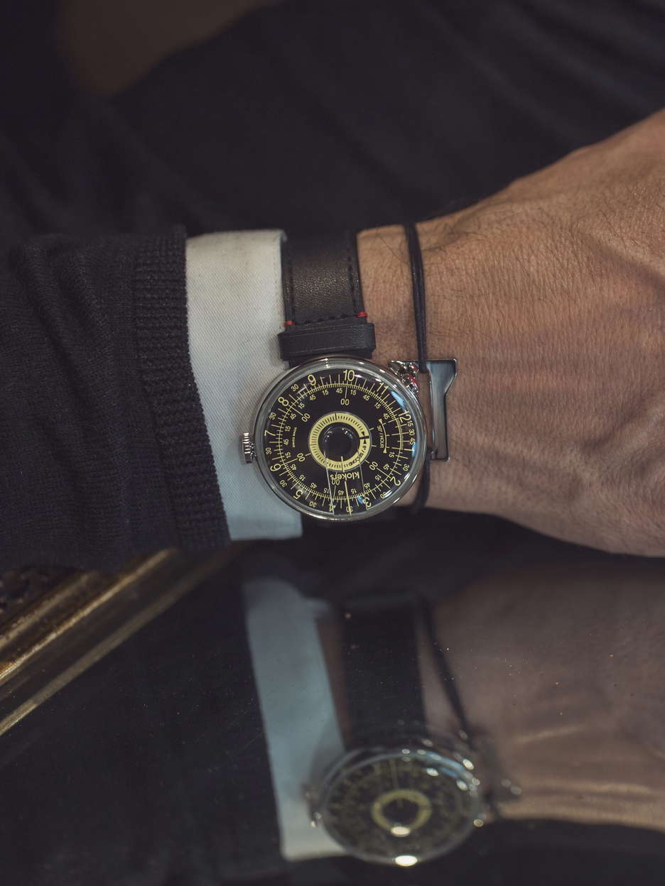 In 2017, Klokers unveiled the KLOK 08, a watch designed for both men and women, paying homage to the vibrant and transformative 1960s. This era, known for its bold pop art, design, and fashion, significantly influenced the style of KLOK 08s. The watch embodies the geometric and rounded aesthetics characteristic of the Space Age, featuring a hemispheric case that captures the essence of the 1960s design. During the 1960s, the color black emerged as both a political symbol and a representation of modern art theories. Today, this influence is beautifully reflected in the KLOK 08’s polished metal case with a warm black dial and patinated yellow markings. The KLOK 08 Sixties features the unique Klokers key, a patented attachment system. This innovative design allows for easy detachment of the watch case from the strap, offering the flexibility to change straps according to personal style and mood. This interchangeability transforms the KLOK 08 into a versatile and timeless accessory for everyday wear. Time-telling in the KLOK 08 is achieved through three rotating rings for hours, minutes, and seconds, with time read at the 12 o’clock position marked by a vertical line. The watch’s interior boasts a Cyclops-type device on the mineral crystal, slightly magnifying the numbers for easier reading. While the minute track has 60 lines for each minute, the watch is often more conveniently read in 15-minute intervals, though closer inspection allows for more precise time determination. The case, 39mm wide and 10mm high, is surprisingly light and comfortable, powered by a Quartz movement from Ronda, a Swiss manufacturer known for its quality quartz movements. It is designed to be unisex and appealing to all with its various color schemes and strap options.