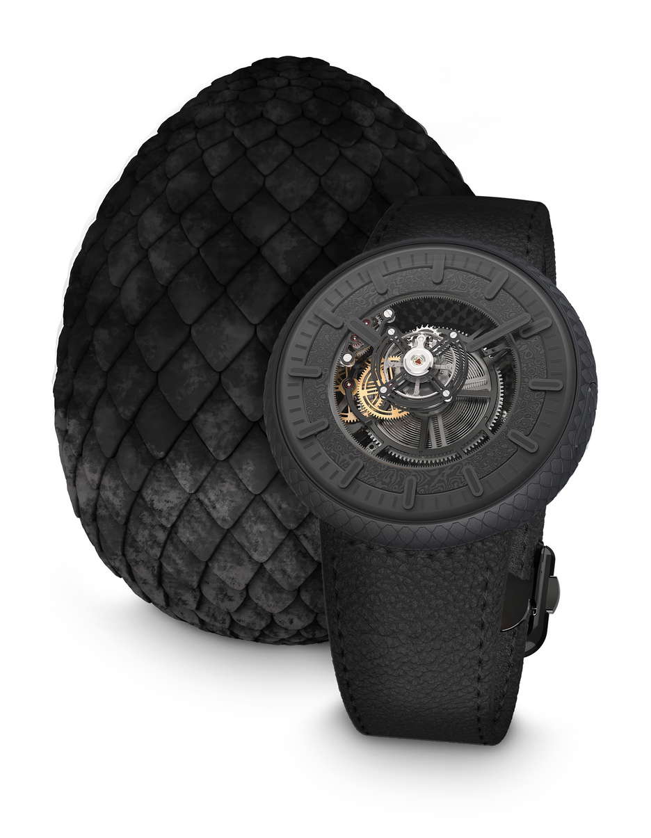 Kross Studio, in collaboration with Warner Bros. Discovery Global Consumer Products, presents an innovative collection inspired by the iconic universe of “Game of Thrones” and its successor series, “House of the Dragon.” Renowned for pushing the boundaries of design, Kross Studio introduces a series of exclusive collector sets, each paying homage to a dragon from the fantasy saga. Each set comprises a central floating tourbillon watch and a dragon egg sculpture, embodying the essence of Targaryen royalty and the mystique of dragons. At the heart of these collector sets lies the central tourbillon, a masterpiece of horology designed by Kross Studio Founder Marco Tedeschi. The tourbillon reflects the distinct aesthetic codes of House Targaryen, from its opulent case to its intricate movement. The floating tourbillon’s suspension beneath a sapphire crystal dome offers a captivating view of the watch’s inner workings, reminiscent of a dragon gliding through the heavens. The Games of Thrones—House of Dragons Collector Set integrates elements from the fantasy series, including a Damasteel® dial reminiscent of Valyrian steel and a titanium case engraved with intricate dragon scales. Each of the 10 collector sets is dedicated to a specific dragon, and the dragon’s name is engraved on the case back, adding a personalized touch to each piece. Each set comes with a unique dragon egg sculpture made by the French workshop Leblon Delienne. Each resin egg, airbrushed to achieve a unique finish, serves as a nest for the watch and draws inspiration from the appearance of its corresponding dragon. The attention to detail extends to the egg’s design, featuring elements inspired by Dragonstone Castle, the ancestral seat of House Targaryen.