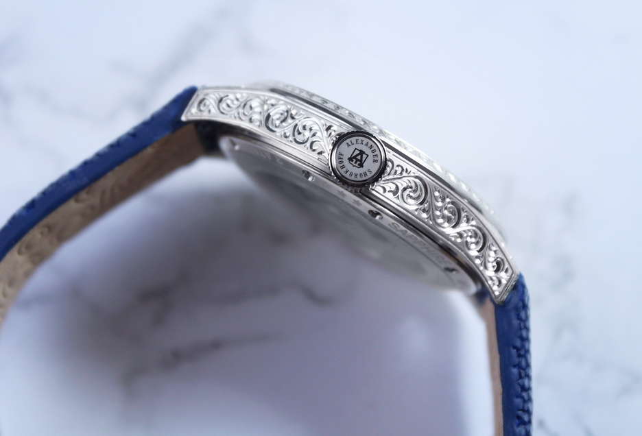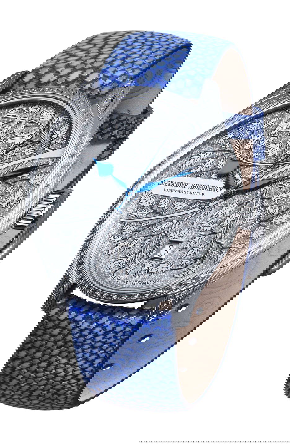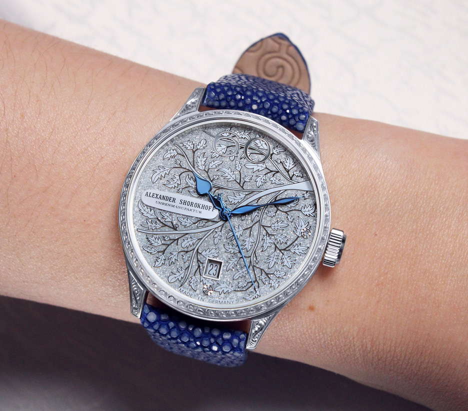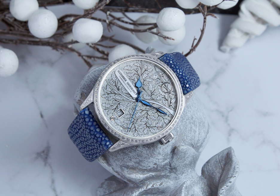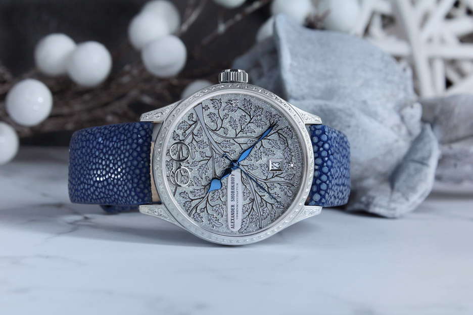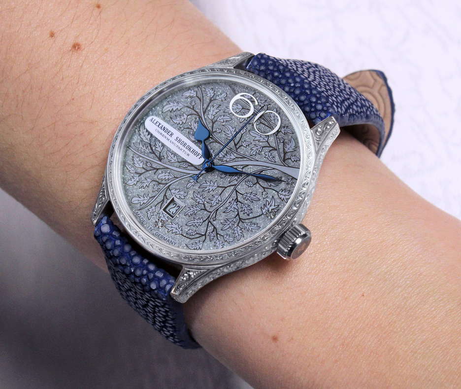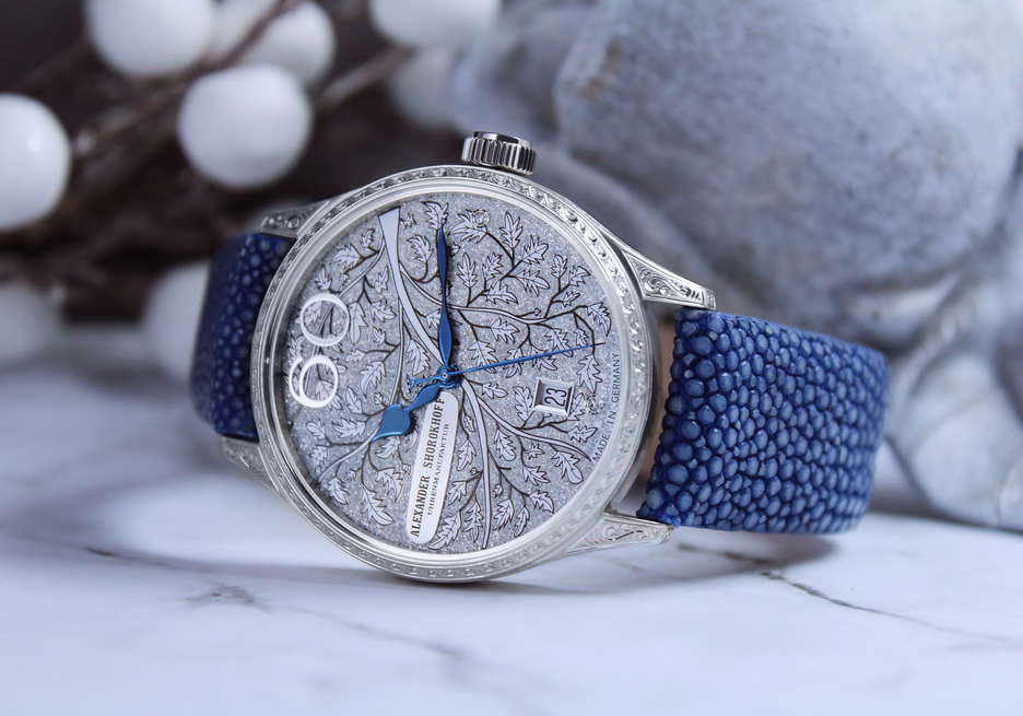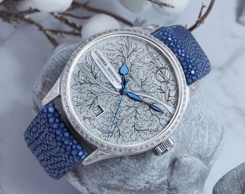 Alexander Shorokhoff has unveiled the Wintergenta, a spectacular timepiece that distinguishes itself with unique, detailed hand engravings on a real silver case. It features a dial embellished with diamond dust through a novel technique, creating a glistening effect reminiscent of diamond snow, and showcases a distinctive leaf motif, fully embodying the spirit of the anniversary. The Wintergenta transcends mere jewelry status, elevating it to a form of art. It boasts an exquisitely hand-engraved and decorated rotor within its automatic movement, which perfectly matches the hand-engraved 925 silver case measuring 39 millimeters in diameter, all protected by double-sided sapphire glass, reflecting Alexander Shorokhoff’s commitment to excellence. Ultimately, this piece emerges as a subtle and elegant watch that mesmerizes with its unique and forward-thinking design, available in a strictly limited edition of just 50 pieces.
