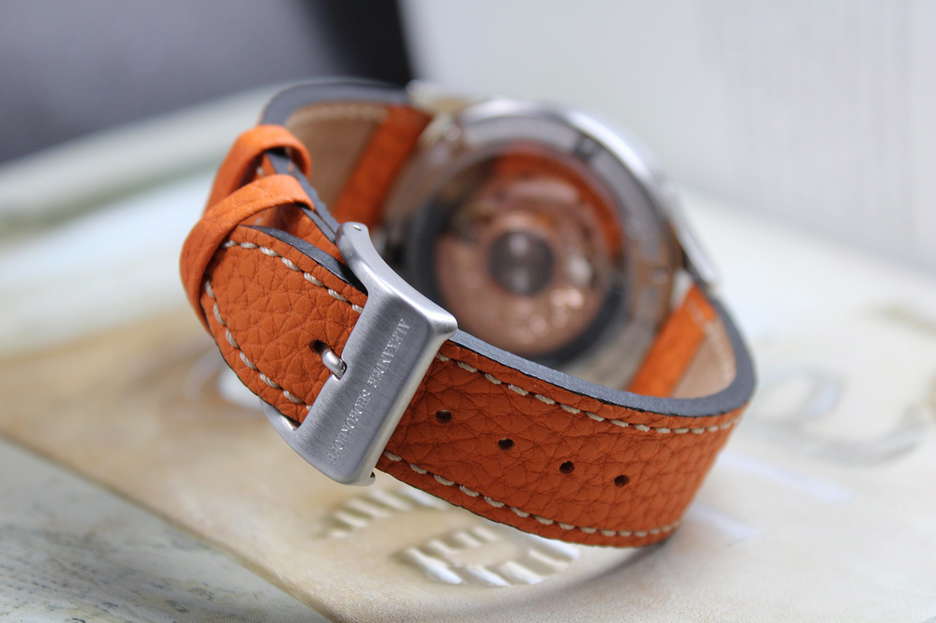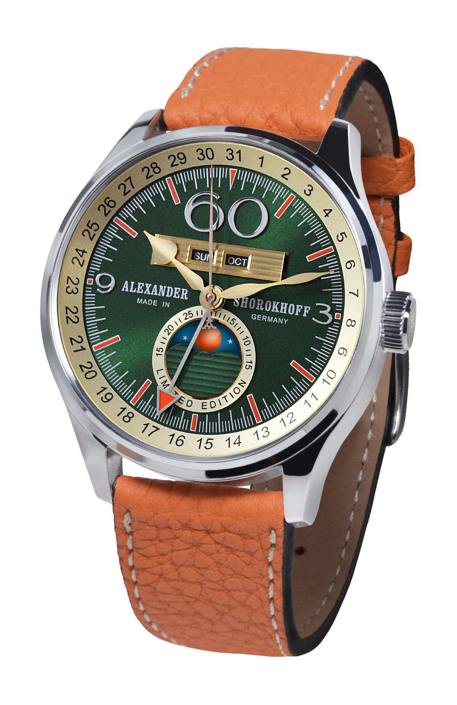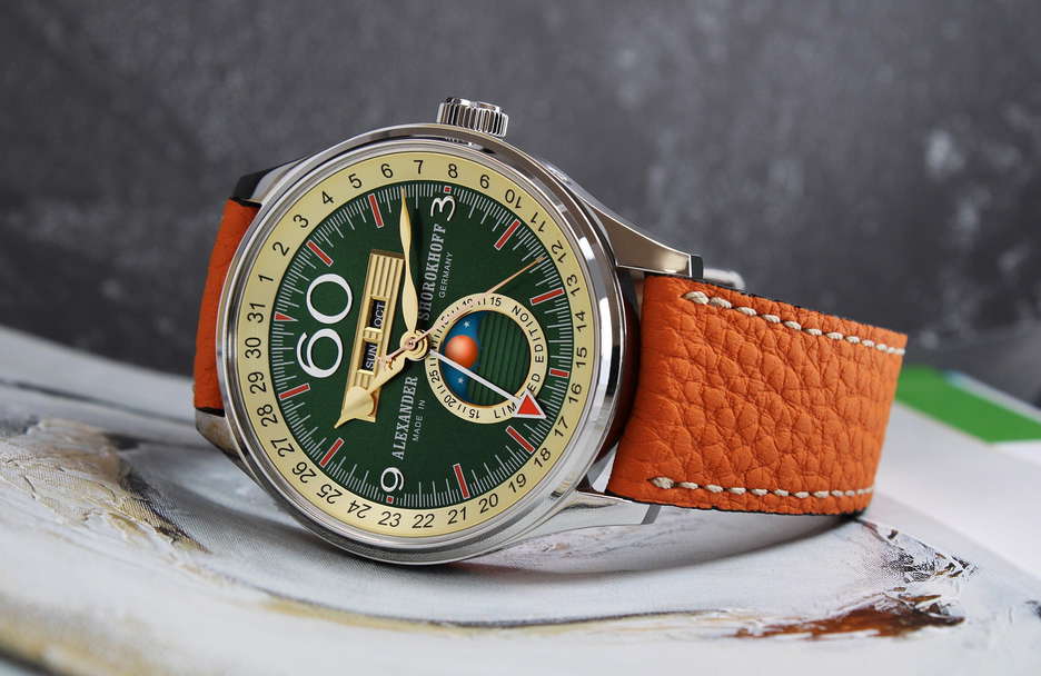 Alexander Shorokhoff has released a new watch model named “Merkur,” characterized by a full calendar and a design inspired by the planet Mercury. The Merkur displays the time, date, day of the week, and month, offering a comprehensive view of important date information. It also features a lunar phase display at the 6 o’clock position, allowing enthusiasts to observe various moon phases, including full moon, half-moon, new moon, and waning moon. The watch’s color palette is thoughtfully chosen, comprising rich green, warm gold tones, and vibrant orange, resulting in an attractive and balanced appearance. The Merkur is powered by the automatic caliber DD9000 by Dubois Depraz, with detailed craftsmanship visible in the hand-engraved and embellished rotor, blued screws, and the precision of 25 jewels. The watch ensures durability with a power reserve of approximately 42 hours. With its limited availability—only 31 pieces produced—the Merkur stands out as a unique timepiece for watch enthusiasts.