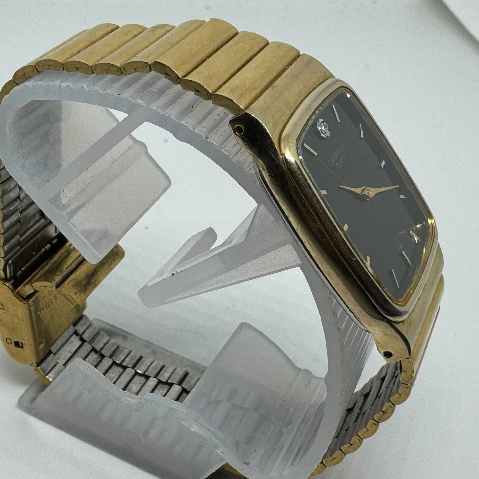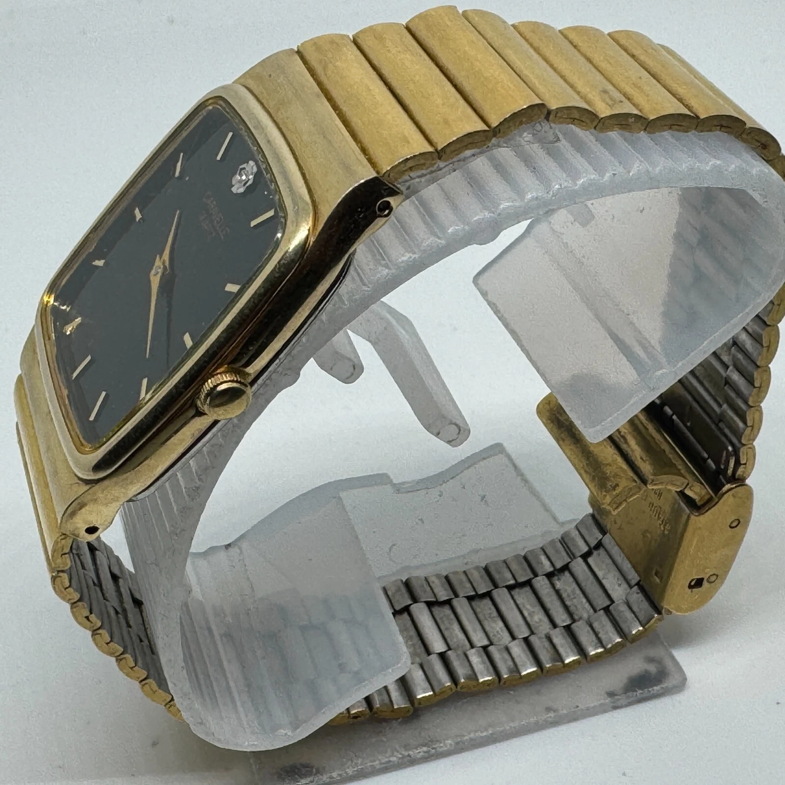 VTG Caravelle Quartz Watch Men Gold Tone Black Diamond Barrel Analog New Battery