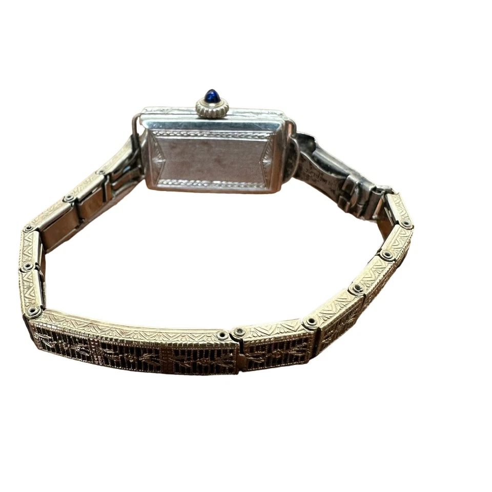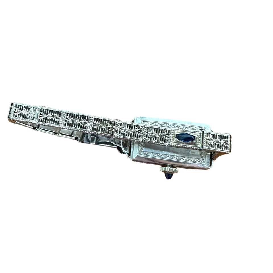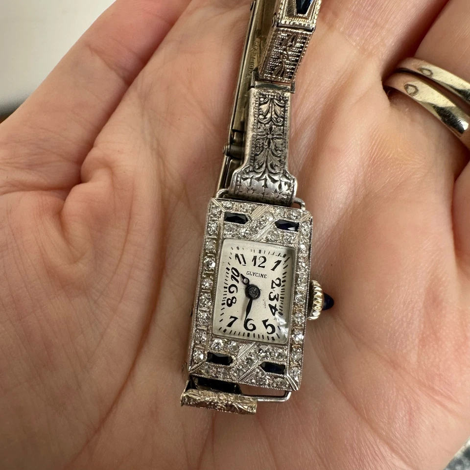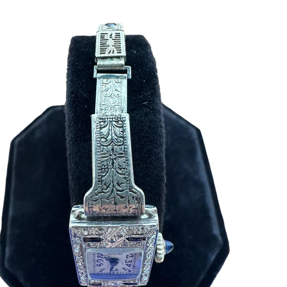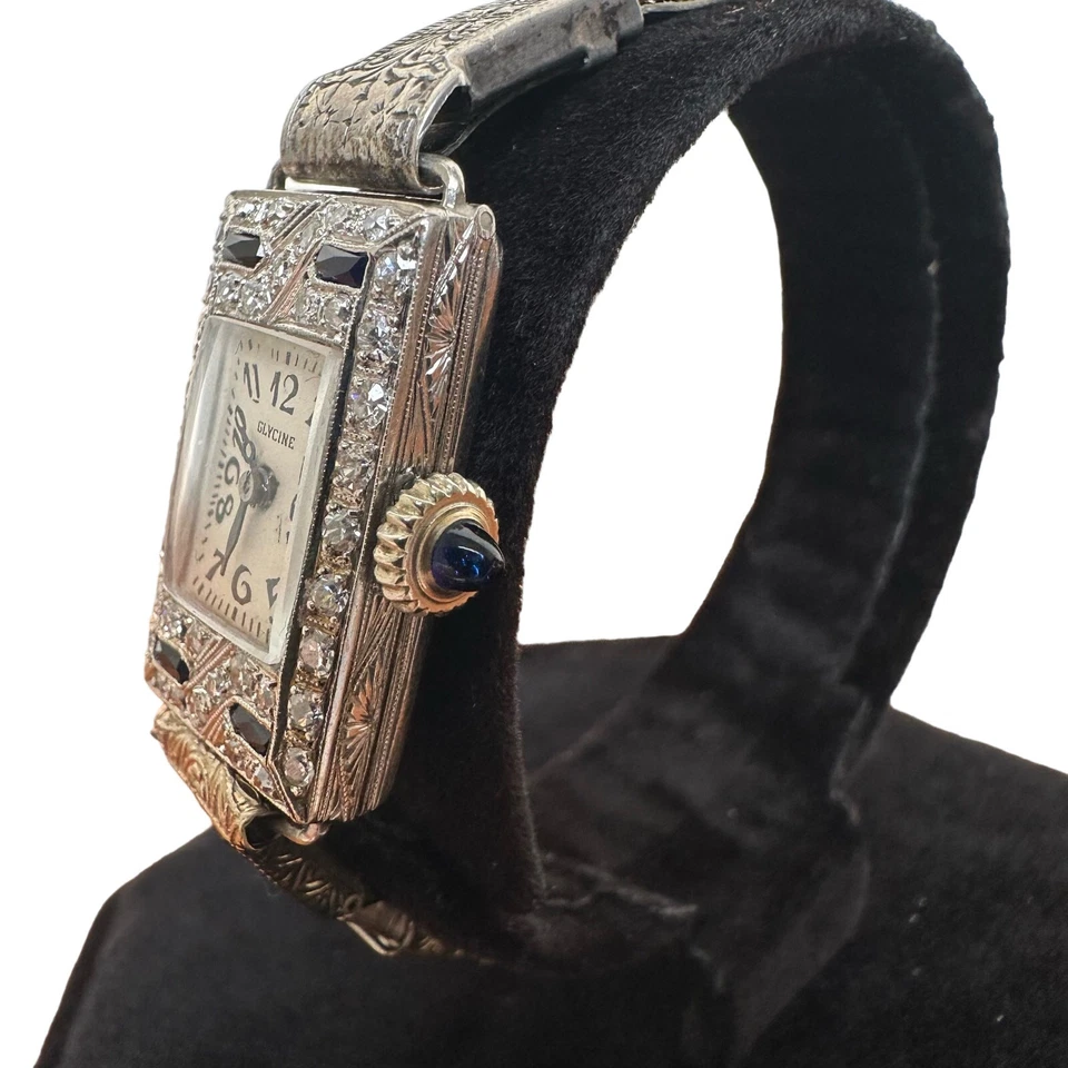Vintage 1920s Glycine Platinum Diamond & Sapphire Watch - Sterling Silver Band
