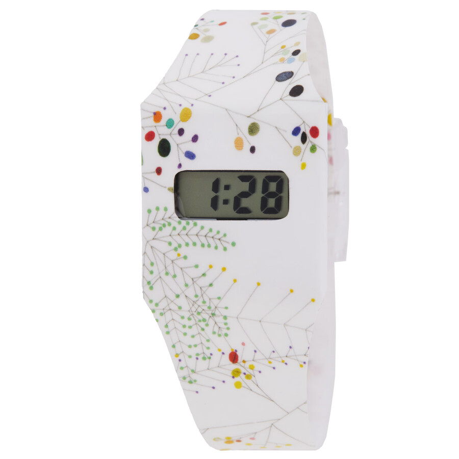 White tyvek case and band. Digital dial. Dial Type: digital. Quartz movement. Solid case back. Square case shape, case size: 25 mm. Buckle clasp. Functions: hour, minute, second. Happy Fern Series. Sport watch style. PappWatch Happy Fern Paperlike Quartz Digital Unisex Watch ILP23232.