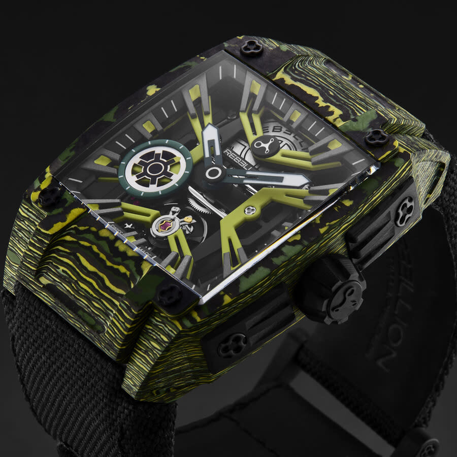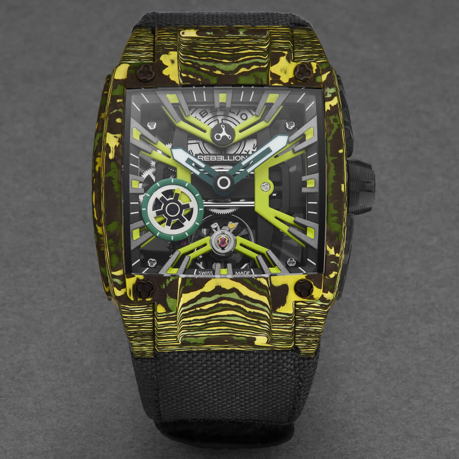 Multi-color fiber case with a black canvas strap. Fixed green carbon fiber bezel. Yellow dial with green hands and index hour markers. Minute markers around the outer rim. Dial Type: Analog. Luminescent hands and markers. Automatic movement. Scratch resistant sapphire crystal. Pull / push crown. Transparent case back. Rectangle case shape, case size: 41.55 mm, case thickness: 12.5 mm. Band width: 30 mm. Fold over clasp. Water resistant at 30 meters / 100 feet. Functions: hour, minute, second. Additional Info: skeletonized property movment manuel winding, 4 hz (28,800 vph). Re-volt Series. Luxury watch style. Rebellion Re-Volt Automatic Men's Watch RB.REV.3H.CA.TXS.