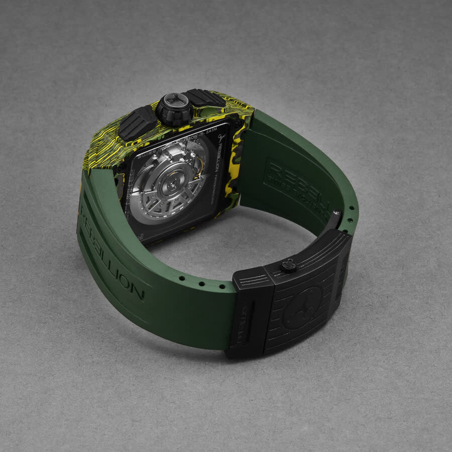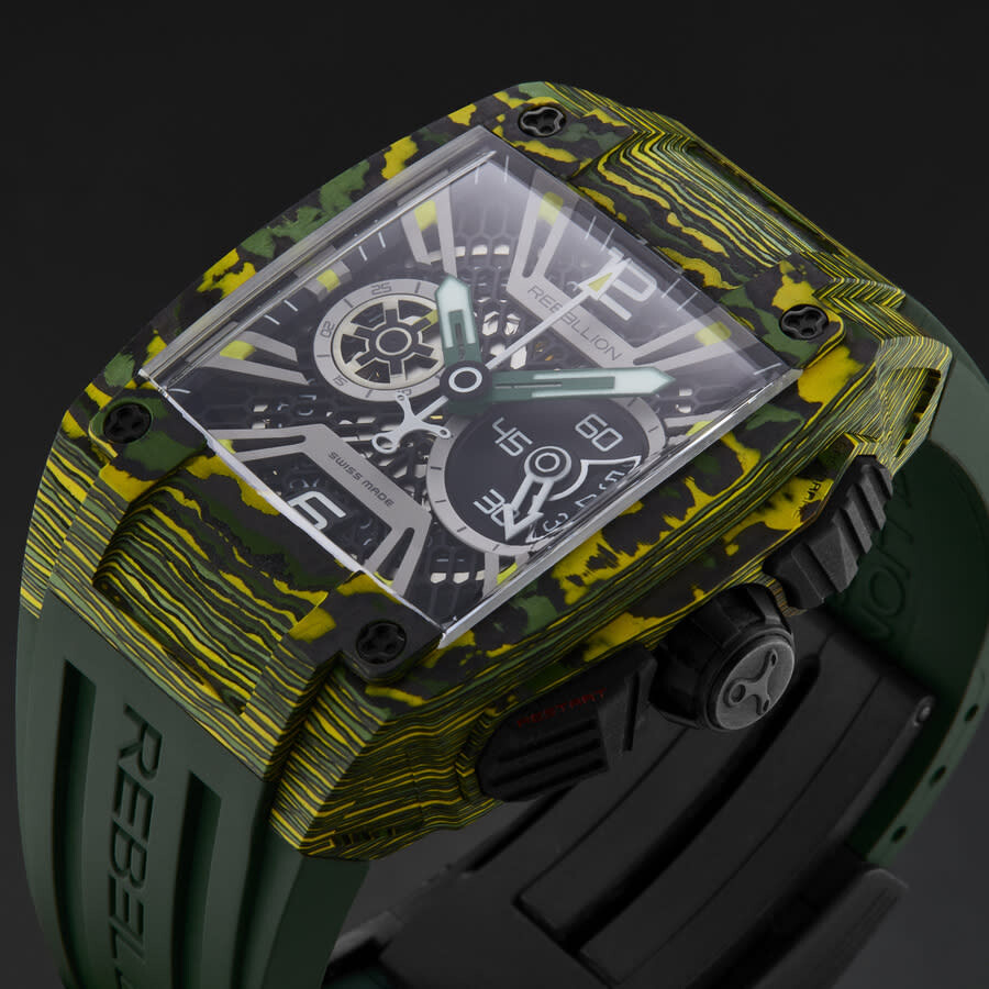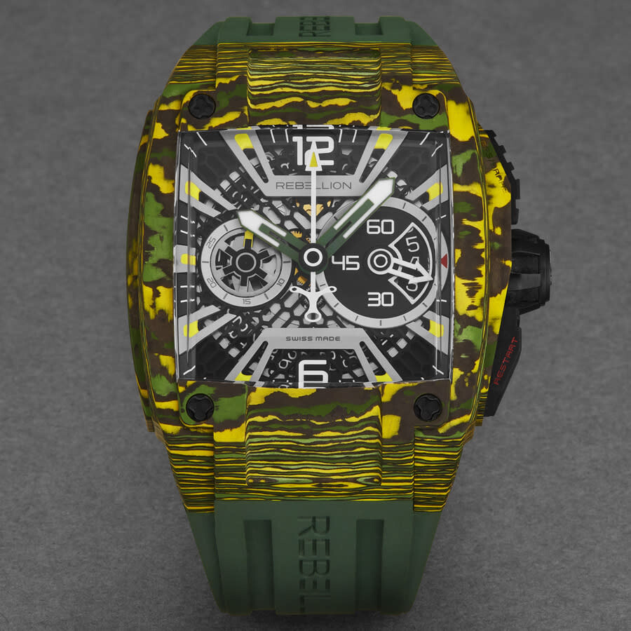 Multi-color titanium case with a green rubber strap. Fixed green carbon fiber bezel. Black dial with green hands and index hour markers. Minute markers around the outer rim. Dial Type: Analog. Luminescent hands and markers. Date display at the 3 o'clock position. Automatic movement. Scratch resistant sapphire crystal. Pull / push crown. Transparent case back. Rectangle case shape, case size: 43.2 mm, case thickness: 13.5 mm. Band width: 30 mm. Deployment with push button release clasp. Water resistant at 30 meters / 100 feet. Functions: chronograph, date, hour, minute, second. Re-volt Series. Luxury watch style. Rebellion Re-Volt Chronograph Automatic Black Dial Men's Watch RB.REV.CH.CA.TXS.