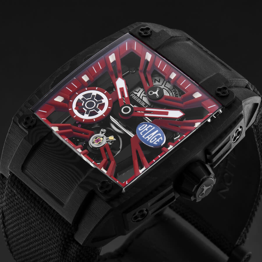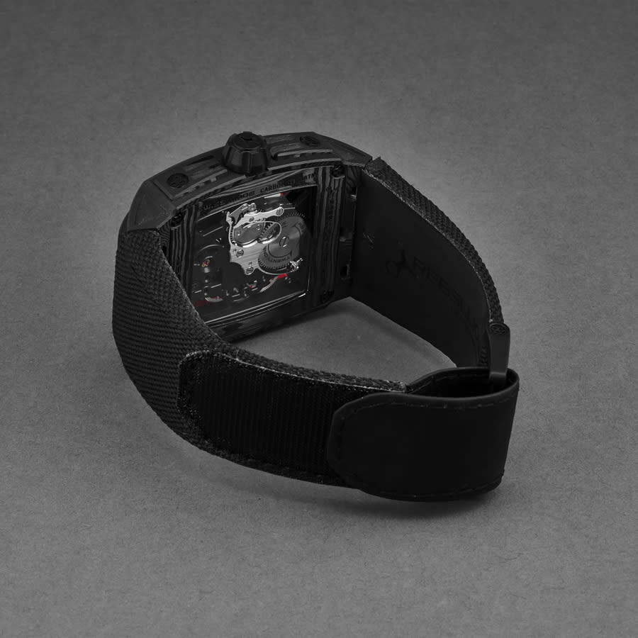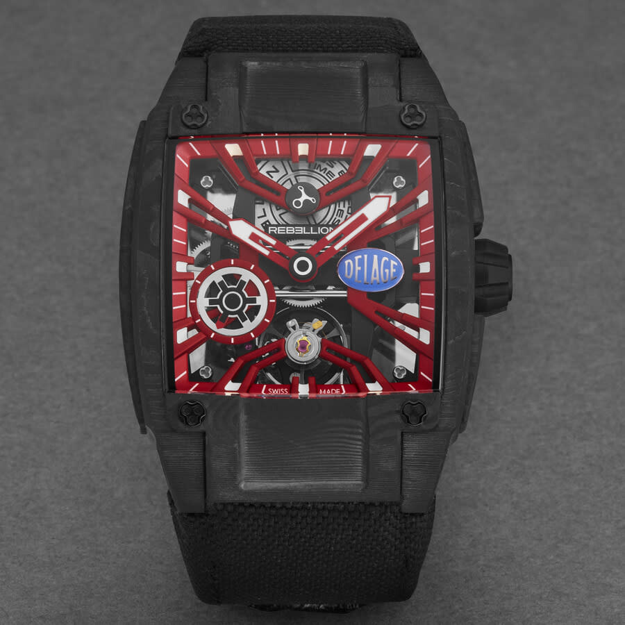 Black fiber case with a black canvas strap. Fixed black carbon fiber bezel. Black dial with black hands and index hour markers. Minute markers around the outer rim. Dial Type: Analog. Luminescent hands and markers. Automatic movement. Scratch resistant sapphire crystal. Pull / push crown. Transparent case back. Rectangle case shape, case size: 41.55 mm, case thickness: 12.5 mm. Band width: 30 mm. Fold over clasp. Water resistant at 30 meters / 100 feet. Functions: hour, minute, second. Additional Info: skeletonized property movment manuel winding, 4 hz (28,800 vph). Re-volt Series. Luxury watch style. Rebellion Re-Volt Automatic Black Dial Men's Watch RB.REV.3H.TC.ADELR.