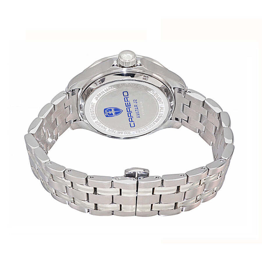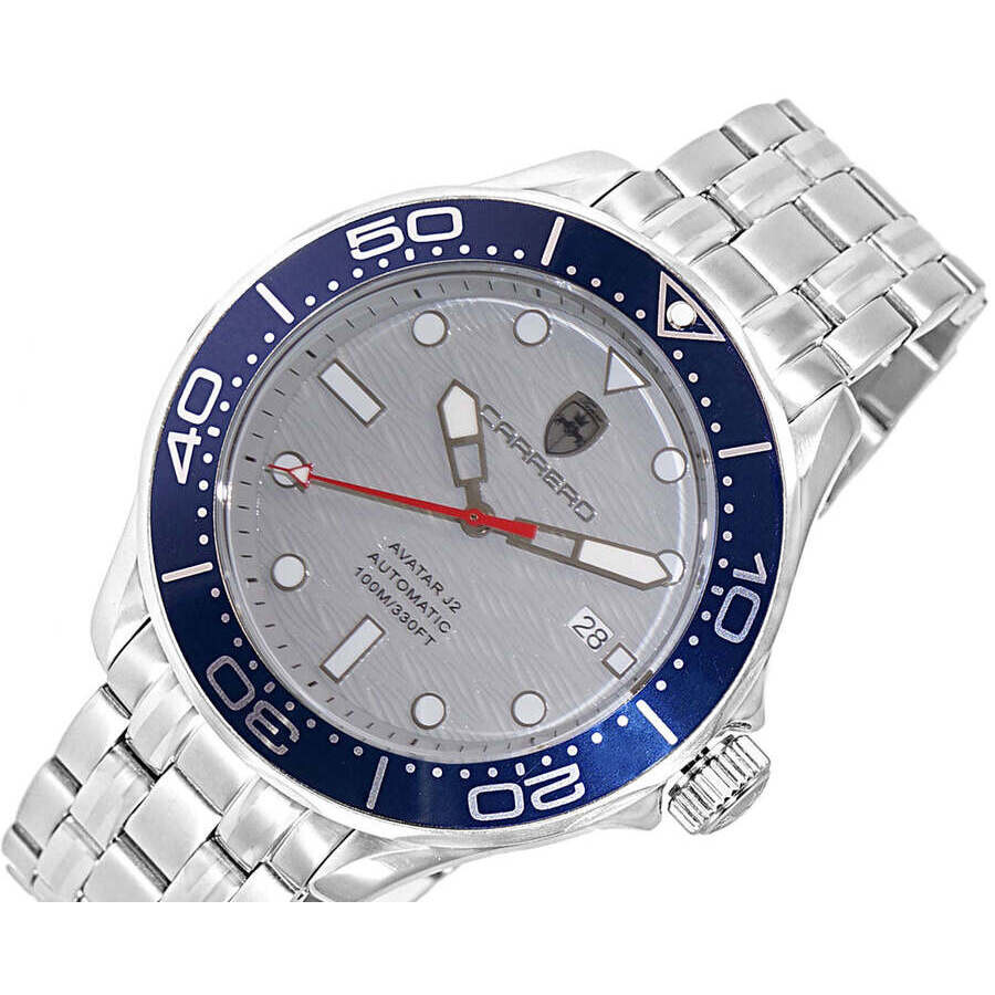 Torino Carrero Men's Avatar Automatic NH35 - 24 JEWELS, Green Date Dial, Silver tone. Silver-tone stainless steel case and bracelet. Uni-directional rotating blue stainless steel bezel. Grey dial with silver-tone hands and Arabic numeral & index hour markers. Minute markers around the outer rim. Dial Type: Analog. Luminescent hands and markers. Date display at the 3 o'clock position. TMI Caliber NH35 Automatic movement, containing 24 Jewels, bitting at 21600 vph, and has a power reserve of approximately 41 hours. Scratch resistant mineral crystal. Screw down crown. Solid case back. Round case shape, case size: 44.5 mm, case thickness: 15 mm. Band width: 22 mm, band length: 7.25 inches. Deployment with push button release clasp. Water resistant at 100 meters / 330 feet. Functions: date, hour, minute, second. Avatar Series. Casual watch style. Watch label: Japan Movt. Torino Carrero Avatar Automatic Grey Dial Men's Watch C1S6161GRJ.