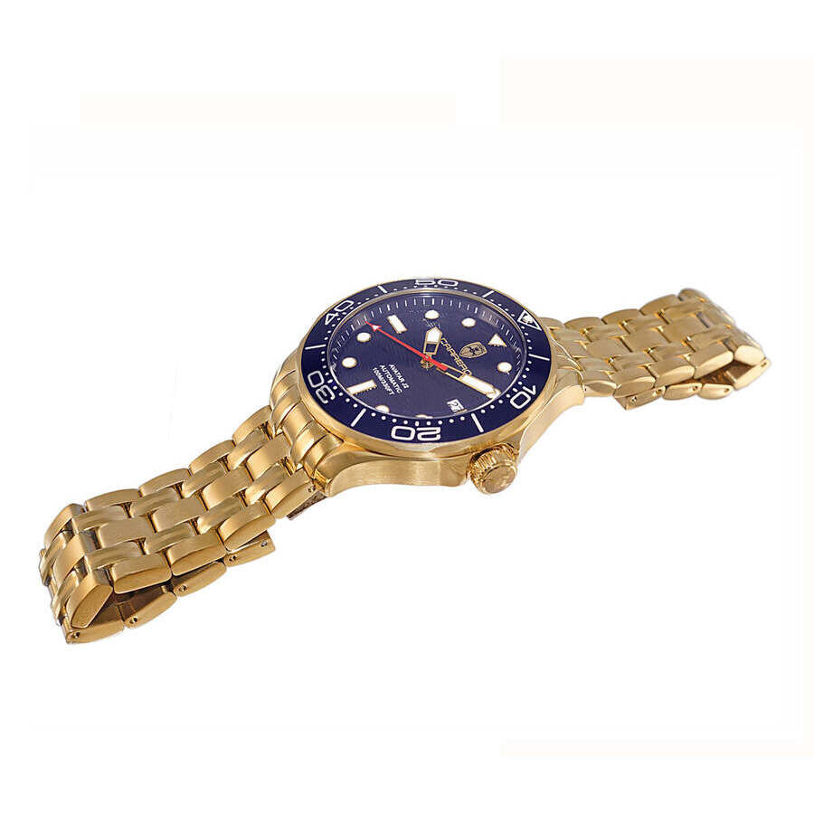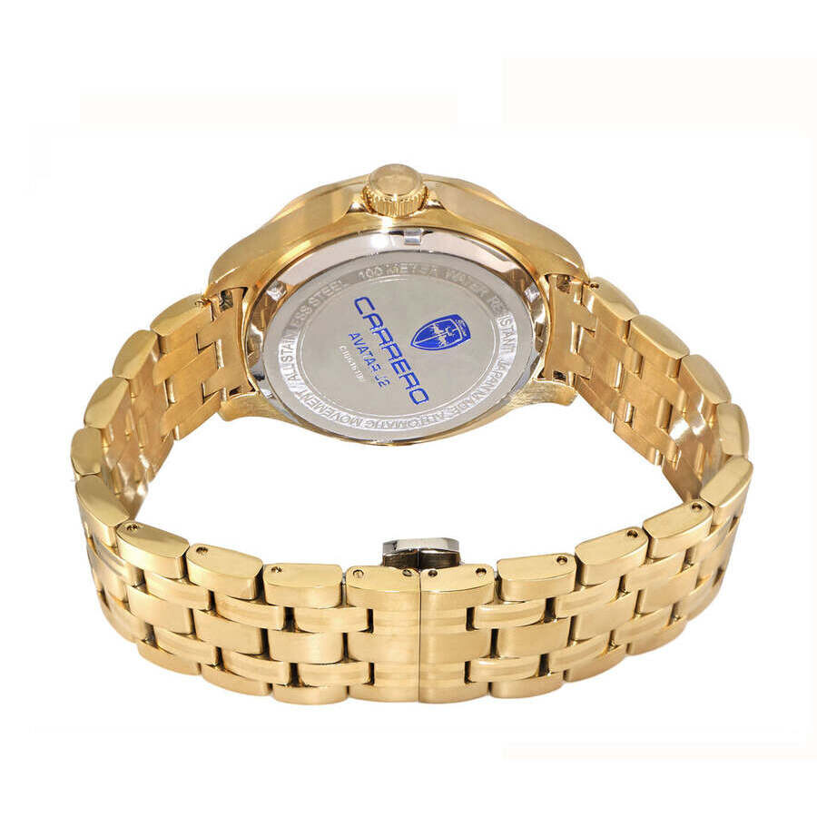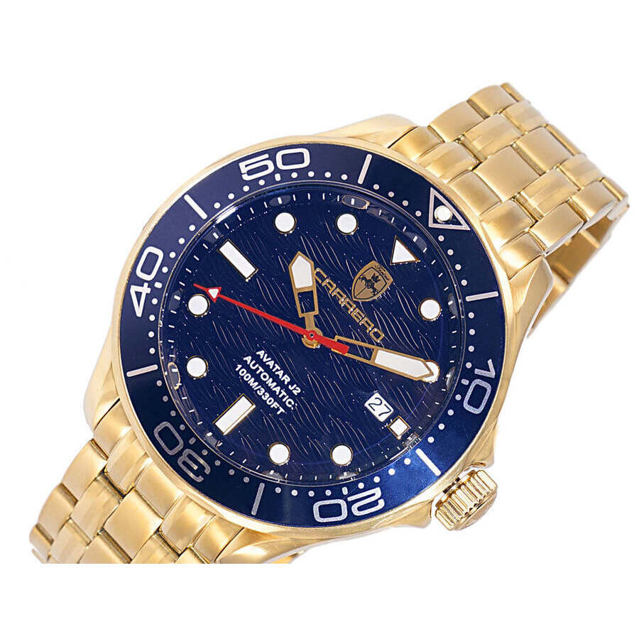Torino Carrero Men's Avatar Automatic NH35 - 24 JEWELS, Blue Date Dial, Gold tone. Yellow gold-tone stainless steel case and bracelet. Uni-directional rotating blue stainless steel bezel. Blue dial with yellow gold-tone hands and Arabic numeral & index hour markers. Minute markers around the outer rim. Dial Type: Analog. Luminescent hands and markers. Date display at the 3 o'clock position. TMI Caliber NH35 Automatic movement, containing 24 Jewels, bitting at 21600 vph, and has a power reserve of approximately 41 hours. Scratch resistant mineral crystal. Screw down crown. Solid case back. Round case shape, case size: 44.5 mm, case thickness: 15 mm. Band width: 22 mm, band length: 7.25 inches. Deployment with push button release clasp. Water resistant at 100 meters / 330 feet. Functions: date, hour, minute, second. Avatar Series. Casual watch style. Watch label: Japan Movt. Torino Carrero Avatar Automatic Blue Dial Men's Watch C1G6161BUJ.