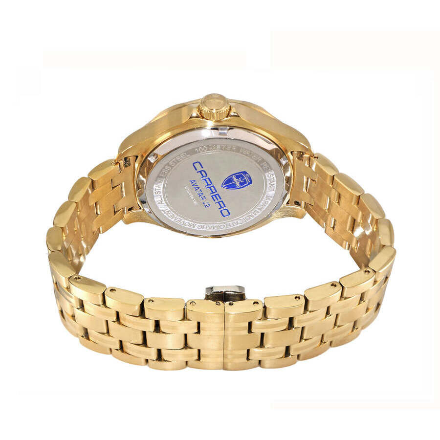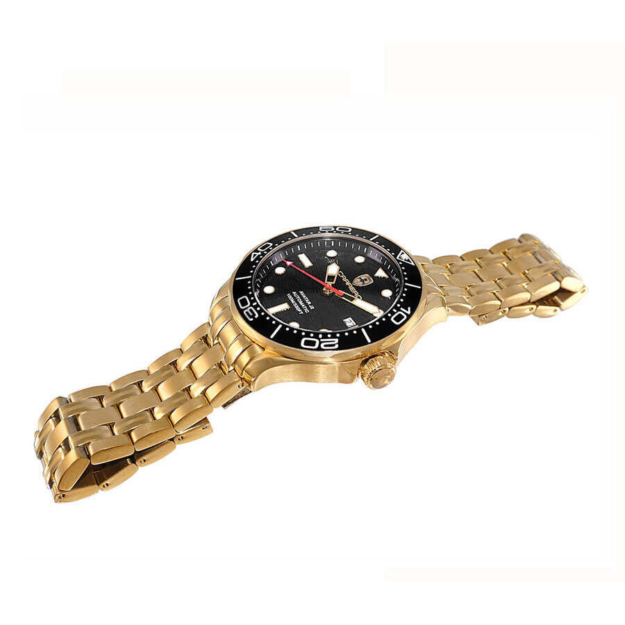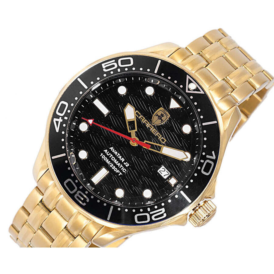Torino Carrero Men's Avatar Automatic NH35 - 24 JEWELS, Black Date Dial, Gold tone. Yellow gold-tone stainless steel case and bracelet. Uni-directional rotating black stainless steel bezel. Black dial with yellow gold-tone hands and Arabic numeral & index hour markers. Minute markers around the outer rim. Dial Type: Analog. Luminescent hands and markers. Date display at the 3 o'clock position. TMI Caliber NH35 Automatic movement, containing 24 Jewels, bitting at 21600 vph, and has a power reserve of approximately 41 hours. Scratch resistant mineral crystal. Screw down crown. Solid case back. Round case shape, case size: 44.5 mm, case thickness: 15 mm. Band width: 22 mm, band length: 7.25 inches. Deployment with push button release clasp. Water resistant at 100 meters / 330 feet. Functions: date, hour, minute, second. Avatar Series. Casual watch style. Watch label: Japan Movt. Torino Carrero Avatar Automatic Black Dial Men's Watch C1G6161BKJ.