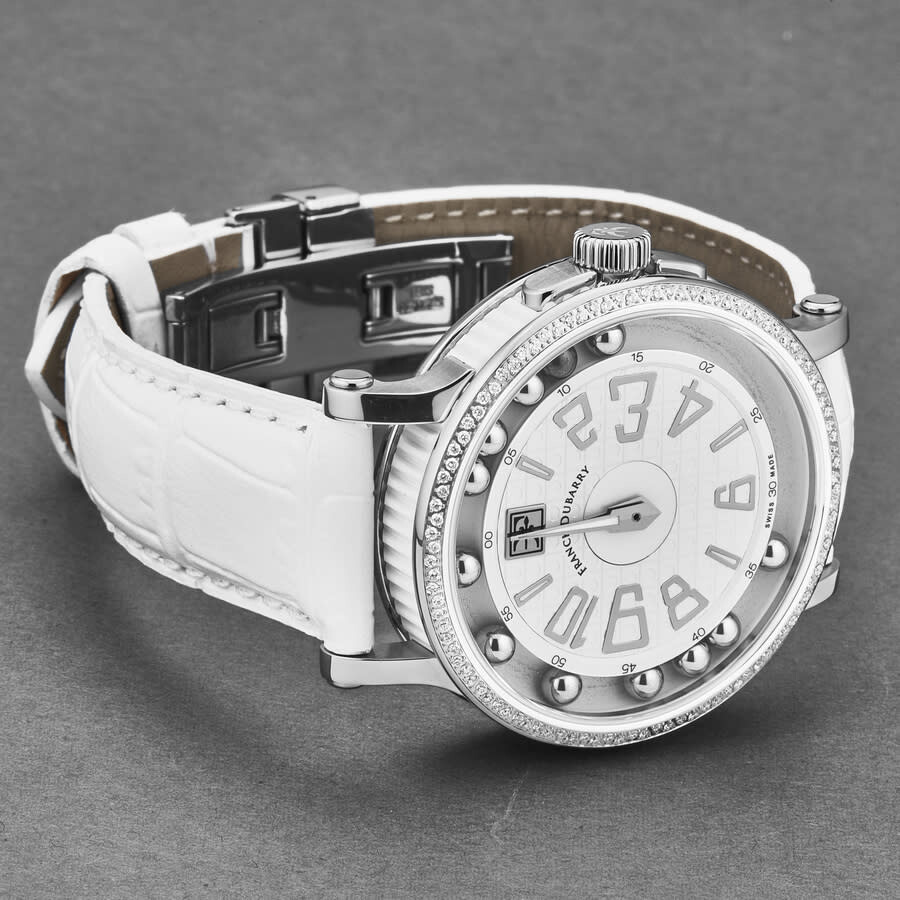 Silver-tone stainless steel case with a white leather strap. Fixed silver-tone stainless steel bezel. White dial with silver-tone hands and Arabic numeral hour markers. Dial Type: Analog. Quartz movement. Scratch resistant sapphire crystal. Pull / push crown. Solid case back. Round case shape, case size: 42 mm, case thickness: 12 mm. Band width: 20 mm, band length: 8 inches. Tang clasp. Functions: hour, minute, second. Crazy Balls Series. Luxury watch style. Watch label: Swiss Made. Franck Dubarry Crazy Balls White Dial Ladies Watch CB0308.