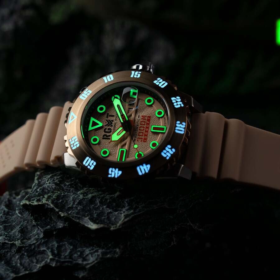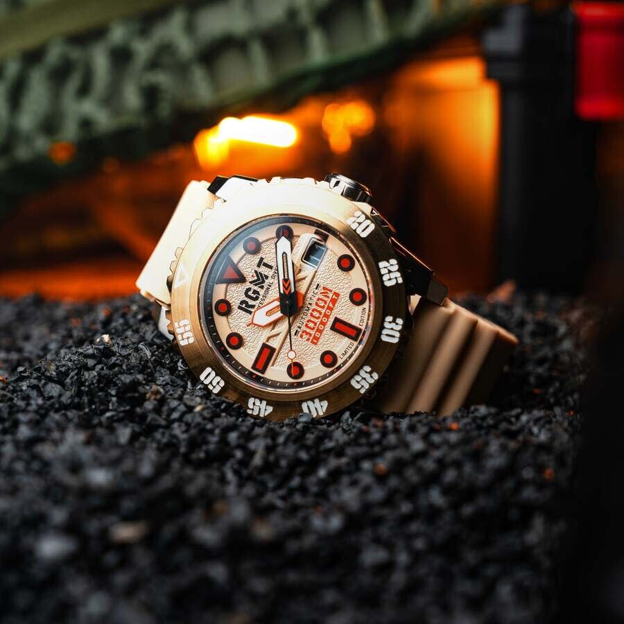 The Ohio Automatic takes its name from the awe-inspiring might and resilience of the US Navy’s OHIO class nuclear-powered ballistic submarines, and are the largest submarines ever to serve the Navy.From cutting-edge marine-grade engineering to ample luminosity, and a scratch-resistant sapphire lens - the watch is truly a feat of watchmaking designed to test the limits. Silver-tone stainless steel case and bracelet. Uni-directional rotating beige stainless steel bezel. Beige dial with silver-tone hands and Arabic numeral & index hour markers. Minute markers around the outer rim. Dial Type: Analog. Luminescent hands and markers. Date display at the 3 o'clock position. Seiko - NH35 automatic movement. Scratch resistant sapphire crystal. Screw down crown. Solid case back. Round case shape, case size: 45 mm, case thickness: 13 mm. Band width: 24 mm, band length: 8 inches. Fold over clasp. Water resistant at 3000 meters / 10000 feet. Functions: date, hour, minute, second. Ohio Series. Dive watch style. RGMT Ohio Beige Dial Men's Watch RG-8034-0H.