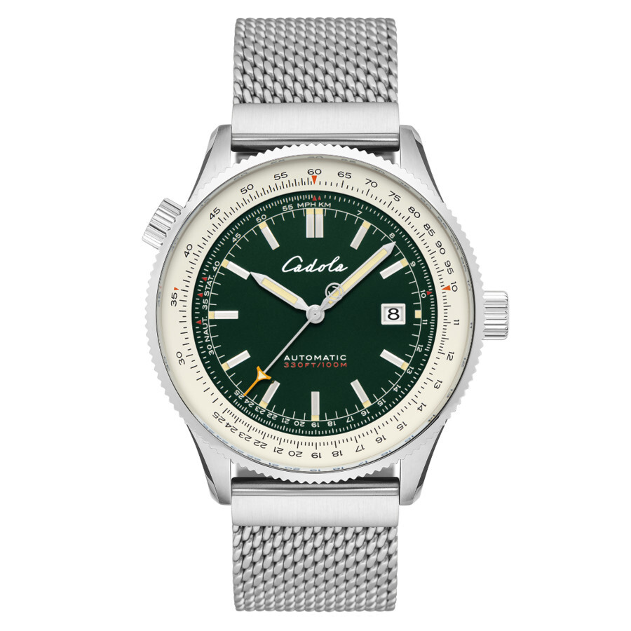 An inner pilot slide rule bezel authenticates the Aviateur as a great aviation tool watch. Powered by a robustly reliable Japanese automatic movement, the watch is a classy piece of wearable timekeeping dipped in an enduring style guaranteed to impress. Silver-tone stainless steel case and bracelet. Uni-directional rotating silver-tone stainless steel bezel. Green dial with silver-tone hands and Arabic numeral & index hour markers. Minute markers around the outer rim. Dial Type: Analog. Date display at the 3 o'clock position. Miyota Caliber 8215 Automatic movement, containing 21 Jewels, bitting at 21600 vph, and has a power reserve of approximately 42 hours. Scratch resistant sapphire crystal. Pull / push crown. Transparent case back. Round case shape, case size: 44 mm, case thickness: 14 mm. Band width: 22 mm, band length: 8 inches. Fold over clasp with a safety release. Water resistant at 100 meters / 330 feet. Functions: date, hour, minute, second. Aviateur Series. Casual watch style. Watch label: Japan Movt. Cadola Aviateur Automatic Green Dial Men's Watch CD-1008-55.