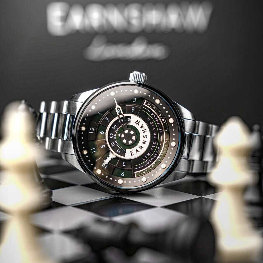 Inspired by the remarkable legacy of Howard Staunton (1810-1874), an influential figure in modern chess history, this exceptional masterpiece combines elegance, precision, and intelligence. It is a symbol of the perfect fusion between the artistry of watchmaking and the timeless allure of chess, capturing the essence of meticulous craftsmanship and strategic brilliance. Silver-tone stainless steel case and bracelet. Fixed black stainless steel bezel. Green dial with black hands and index hour markers. Minute markers around the outer rim. Dial Type: Analog. SII Caliber NH35A Automatic movement, containing 24 Jewels, bitting at 21600 vph, and has a power reserve of approximately 41 hours. Scratch resistant sapphire crystal. Screw down crown. Solid case back. Round case shape, case size: 42 mm, case thickness: 15 mm. Band width: 20 mm, band length: 8 inches. Fold over clasp with a safety release. Water resistant at 100 meters / 330 feet. Functions: date, hour, minute, second. Staunton Chess Set Series. Casual watch style. Watch label: Japan Movt. Thomas Earnshaw Staunton Chess Set Automatic Green Dial Men's Watch ES-8282-77.