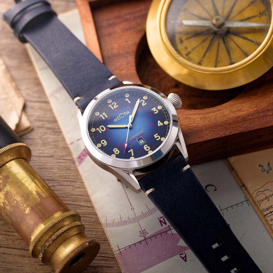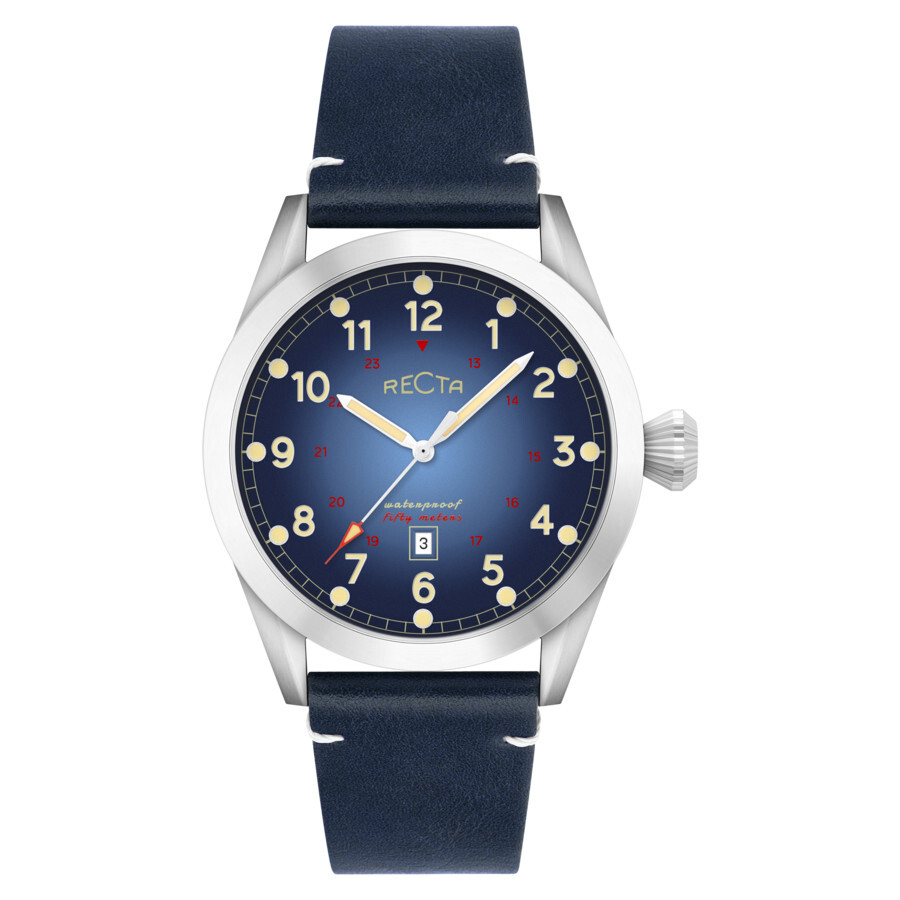 The Cavalier has a spirit of bravado that is anchored around a mission-critical need for functionality. It's fuss-free, reliable, and precise. Silver-tone stainless steel case with a blue genuine leather strap. Fixed silver-tone stainless steel bezel. Blue dial with silver-tone hands and Arabic numeral hour markers. Minute markers around the outer rim. Dial Type: Analog. Luminescent hands and markers. Date display at the 6 o'clock position. Seiko - VJ32 quartz movement. Scratch resistant mineral crystal. Pull / push crown. Solid case back. Round case shape, case size: 45 mm, case thickness: 12 mm. Band width: 24 mm, band length: 8 inches. Water resistant at 50 meters / 165 feet. Functions: date, hour, minute, second. Cavalier Series. Casual watch style. Recta Cavalier Quartz Blue Dial Men's Watch RT-3005-05.