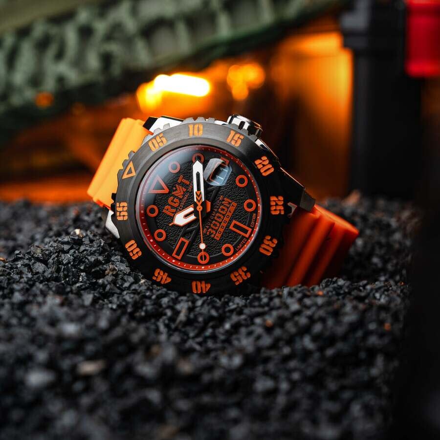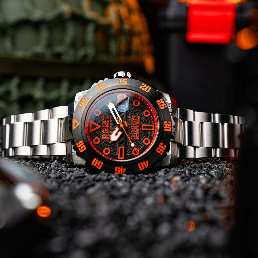 The Ohio Automatic takes its name from the awe-inspiring might and resilience of the US Navy’s OHIO class nuclear-powered ballistic submarines, and are the largest submarines ever to serve the Navy.From cutting-edge marine-grade engineering to ample luminosity, and a scratch-resistant sapphire lens - the watch is truly a feat of watchmaking designed to test the limits. Silver-tone stainless steel case and bracelet. Uni-directional rotating black stainless steel bezel. Black dial with silver-tone hands and index hour markers. Minute markers around the outer rim. Dial Type: Analog. Luminescent hands and markers. Date display at the 3 o'clock position. Seiko - NH35 automatic movement. Scratch resistant sapphire crystal. Screw down crown. Solid case back. Round case shape, case size: 45 mm, case thickness: 13 mm. Band width: 24 mm, band length: 8 inches. Fold over clasp. Water resistant at 3000 meters / 10000 feet. Functions: date, hour, minute, second. Ohio Series. Dive watch style. RGMT Ohio Black Dial Men's Watch RG-8034-0I.