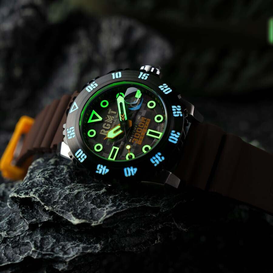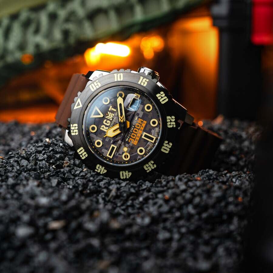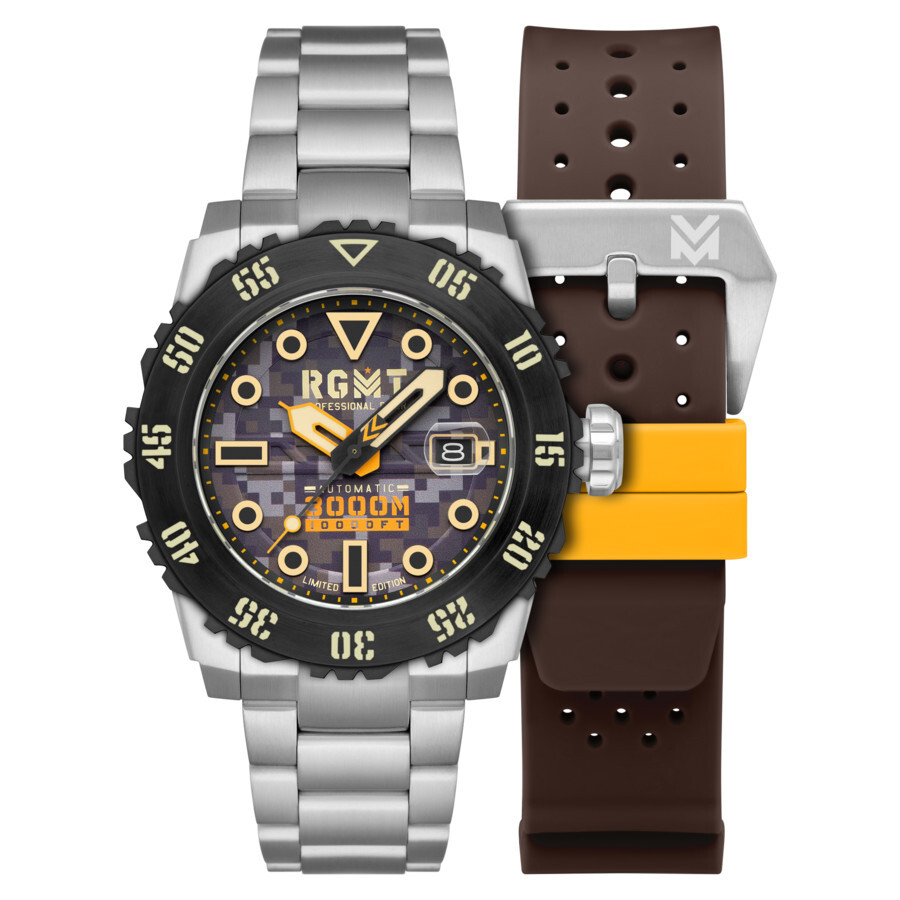 The Ohio Automatic takes its name from the awe-inspiring might and resilience of the US Navy’s OHIO class nuclear-powered ballistic submarines, and are the largest submarines ever to serve the Navy.From cutting-edge marine-grade engineering to ample luminosity, and a scratch-resistant sapphire lens - the watch is truly a feat of watchmaking designed to test the limits. Silver-tone stainless steel case and bracelet. Uni-directional rotating black stainless steel bezel. Brown dial with black hands and index hour markers. Minute markers around the outer rim. Dial Type: Analog. Luminescent hands and markers. Date display at the 3 o'clock position. Seiko - NH35 automatic movement. Scratch resistant sapphire crystal. Screw down crown. Solid case back. Round case shape, case size: 45 mm, case thickness: 13 mm. Band width: 24 mm, band length: 8 inches. Fold over clasp. Water resistant at 3000 meters / 10000 feet. Functions: date, hour, minute, second. Ohio Series. Dive watch style. RGMT Ohio Brown Dial Men's Watch RG-8034-0J.
