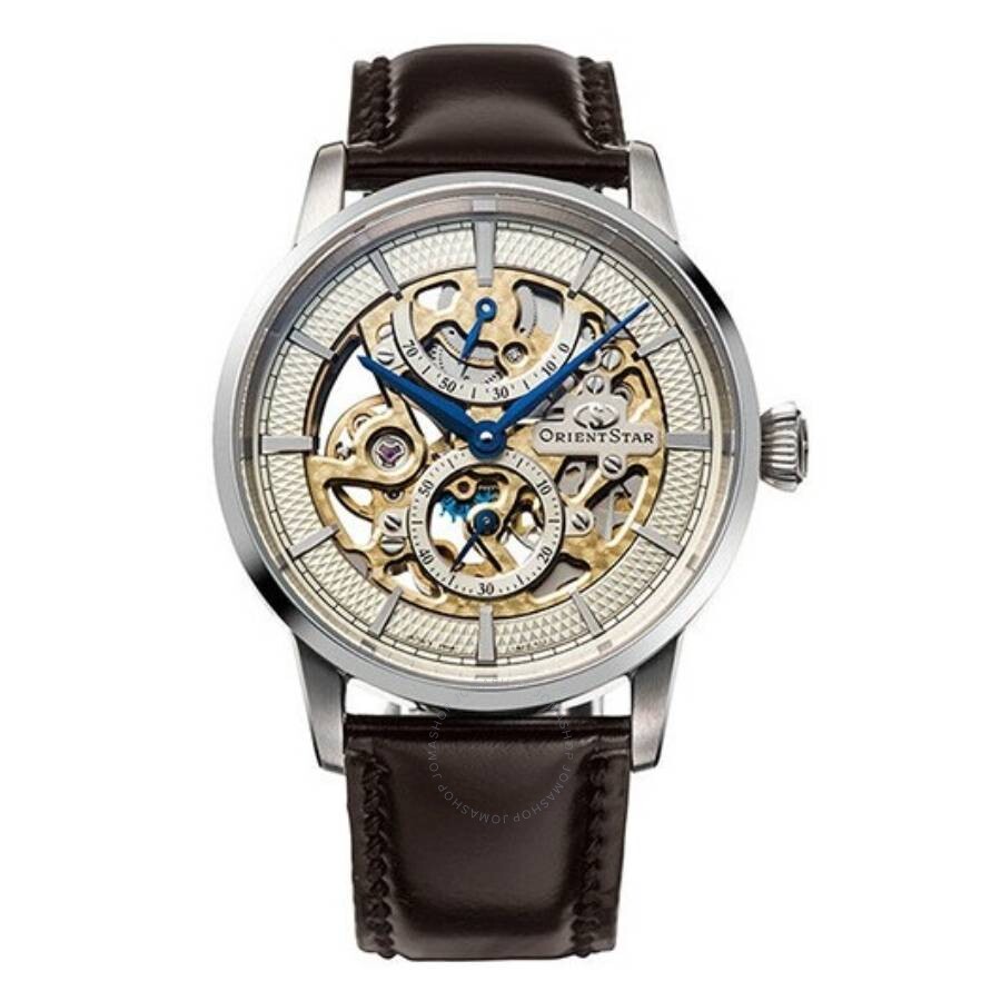 Silver-tone stainless steel case with a brown leather strap. Fixed silver-tone stainless steel bezel. Skeleton dial with blue hands and index hour markers. Minute markers around the outer rim. Dial Type: Analog. Two sub-dials displaying: 60 second and power reserve indicator. Orient Calibre F8B62 manual wind movement with a 70-hour power reserve. Scratch resistant sapphire crystal. Pull / push crown. Transparent see through case back. Round case shape, case size: 38.8 mm, case thickness: 10.8 mm. Band width: 20 mm. Buckle clasp. Water resistant at 50 meters / 165 feet. Functions: hour, minute, second, power reserve indicator. Classic Series. Casual watch style. Watch label: Japan Movt. Orient Classic Manual Wind Skeleton Dial Watch RE-AZ0004S00B.
