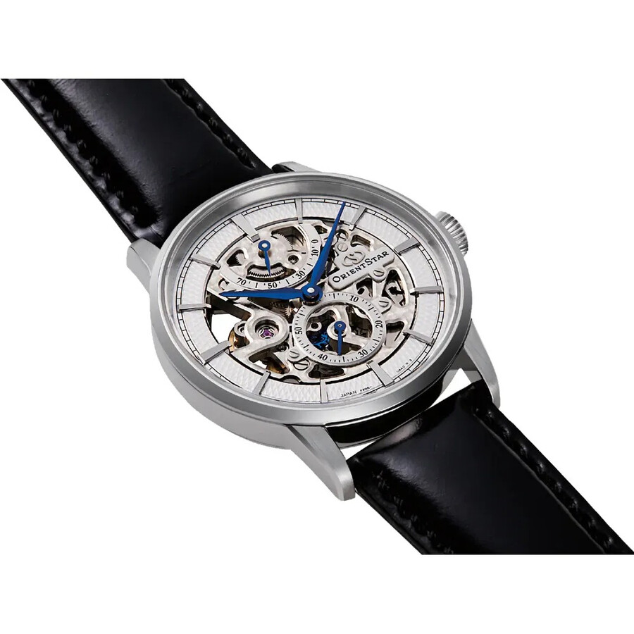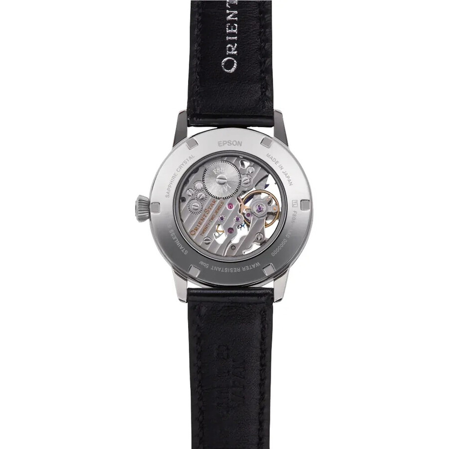 Silver-tone stainless steel case with a black leather strap. Fixed silver-tone stainless steel bezel. White dial with blue hands and index hour markers. Minute markers around the outer rim. Dial Type: Analog. Two sub-dials displaying: 60 second and power reserve indicator. Orient Calibre F8B62 manual wind movement with a 70-hour power reserve. Scratch resistant sapphire crystal. Pull / push crown. Transparent see through case back. Round case shape, case size: 38.8 mm, case thickness: 10.6 mm. Band width: 20 mm. Deployment with push button release clasp. Water resistant at 50 meters / 165 feet. Functions: hour, minute, second, power reserve indicator. Classic Series. Sport watch style. Watch label: Japan Movt. Orient Classic Manual Wind White Dial Men's Watch RE-AZ0005S00B.