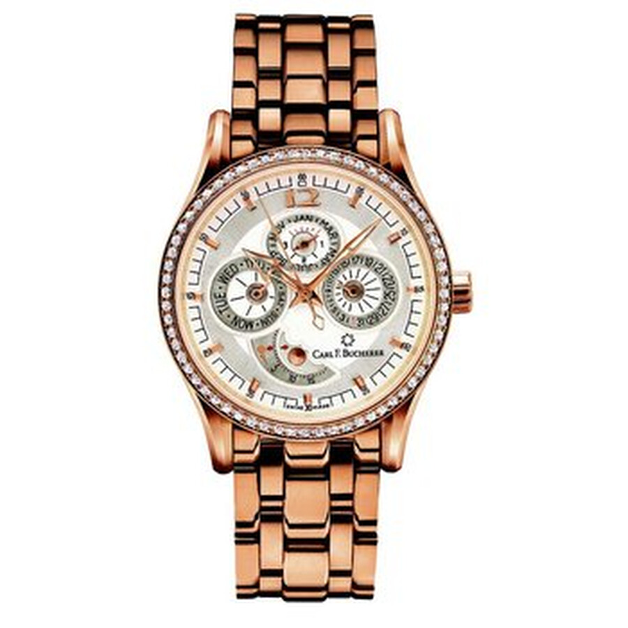 18kt rose gold case with a rose gold-tone 18kt rose gold bracelet. Fixed 18kt rose gold bezel with diamond set. Silver dial with rose gold-tone hands and index-Arabic numeral at the 12 o' clock hour markers. Minute markers around the outer rim. Dial Type: Analog. Date display at the 3 o'clock position. Four sub-dials displaying: date, day of the week, month, moonphase. Carl F. Bucherer Calibre CFB 1955.1 automatic movement with a 42-hour power reserve. Scratch resistant sapphire crystal. Round case shape, case size: 40 mm. Water resistant at 30 meters / 100 feet. Functions: leap year, month, date, day, hour, minute, second, perpetual calendar, moonphase. Additional Info: bezel set with 64 diamonds. Manero Series. Luxury watch style. Watch label: Swiss Made. Item Variations: 169.016.4. Carl F. Bucherer Manero Perpetual Automatic Men's Watch 00.10902.03.16.31.
