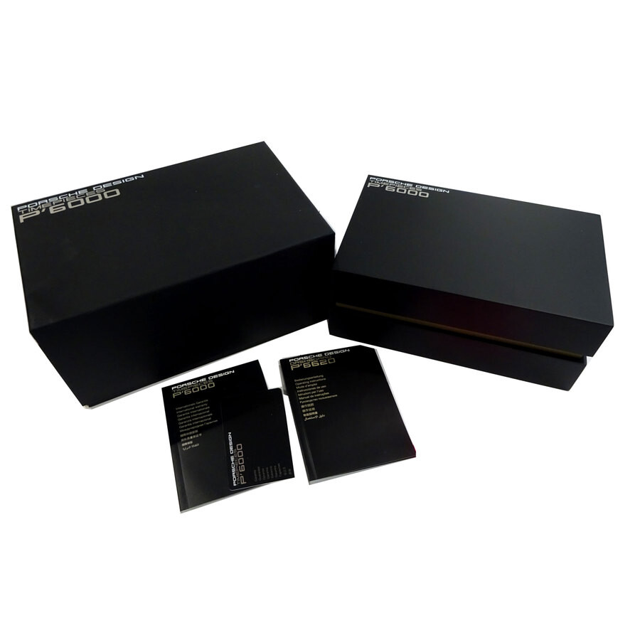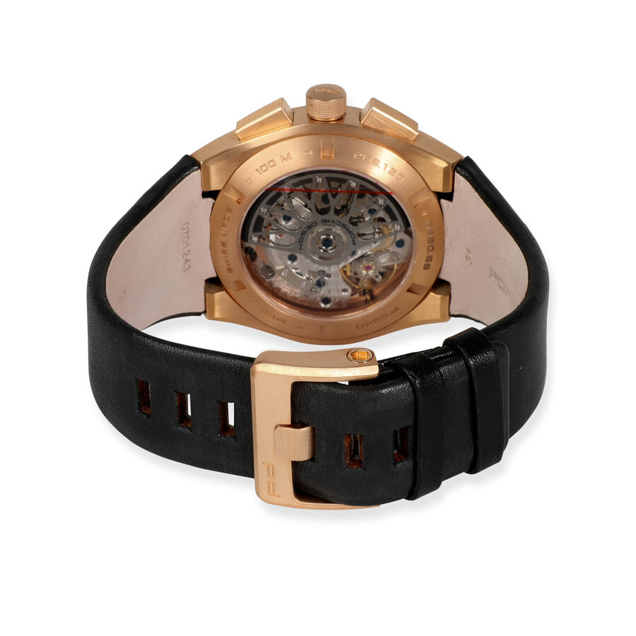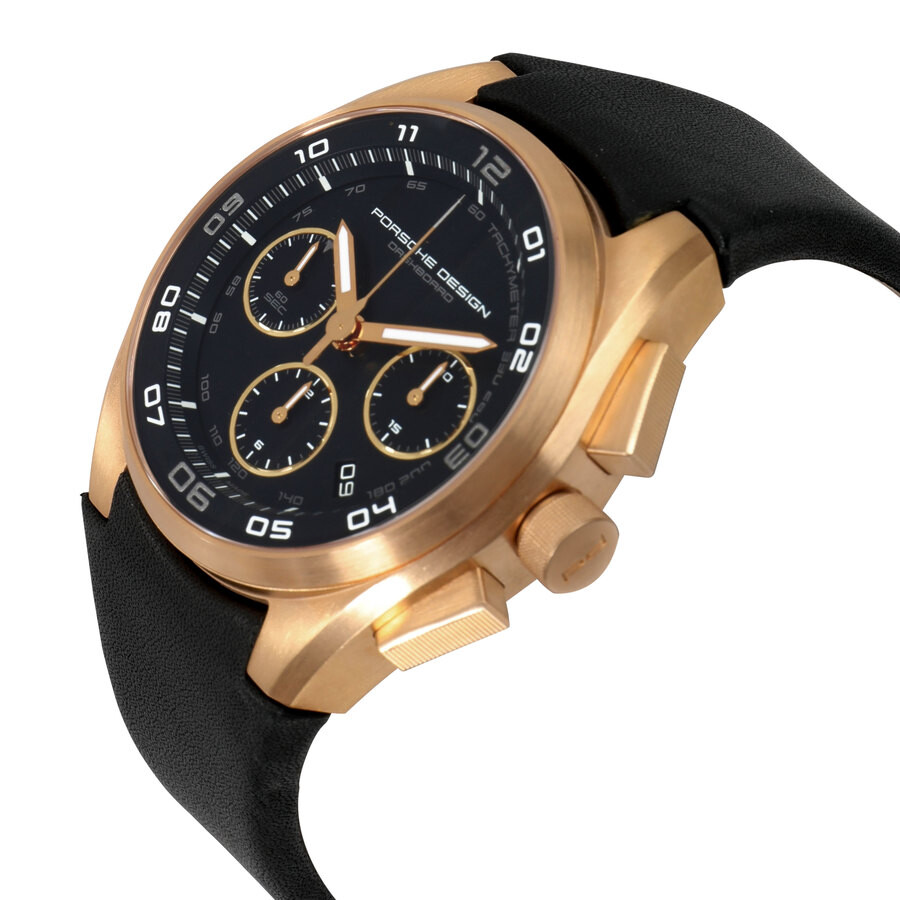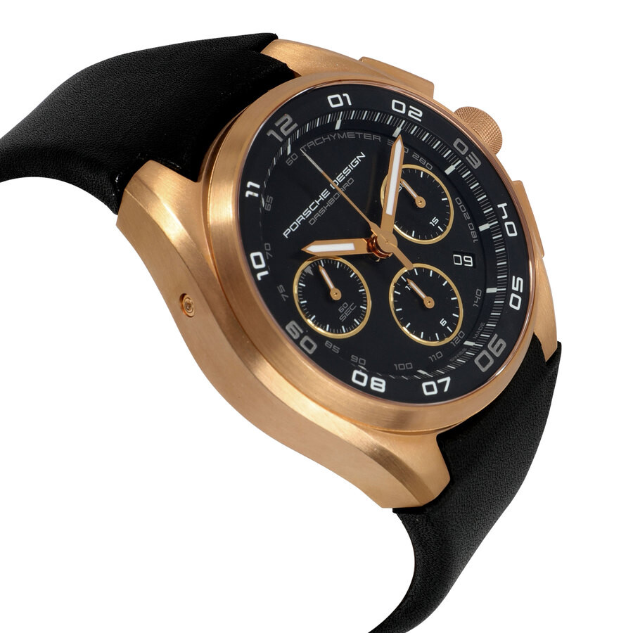 Pre-owned 18kt rose gold case with a black leather strap. Fixed 18kt rose gold bezel. Black dial with luminous rose gold hands and Arabic numeral hour markers. Tachymeter markings. Minute markers around the outer rim. Dial Type: Analog. Luminescent hands. Date display between the 4 and 5 o'clock positions. Chronograph - three sub-dials displaying: 60 second, 30 minute and 12 hour. Automatic movement. Scratch resistant sapphire crystal. Screw down crown. Transparent case back. Case size: 44 mm. Case thickness: 14.5 mm. Round case shape. Band length: 7.5 inches. Tang clasp. Water resistant at 100 meters / 330 feet. Functions: chronograph, tachymeter, date, hour, minute, second. Additional Info: tachymeter display at inner dial. Sport watch style. Watch label: Swiss Made. Porsche Design P6620 Dashboard Chronograph Men's Watch 6620.69.40.1243.