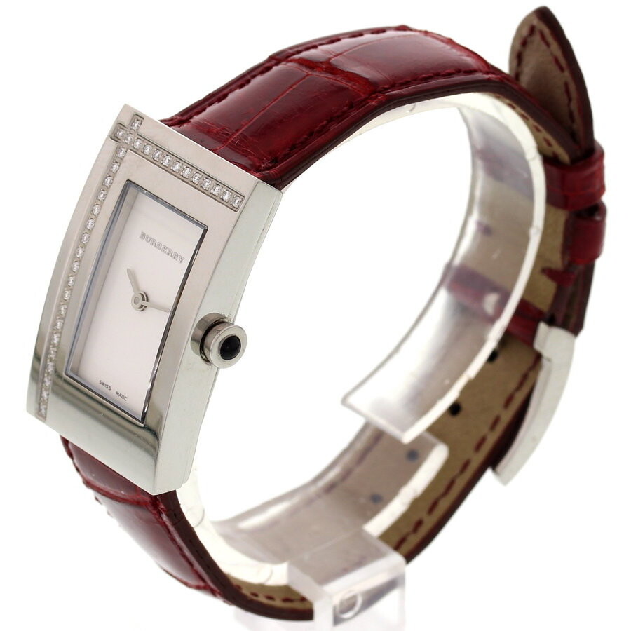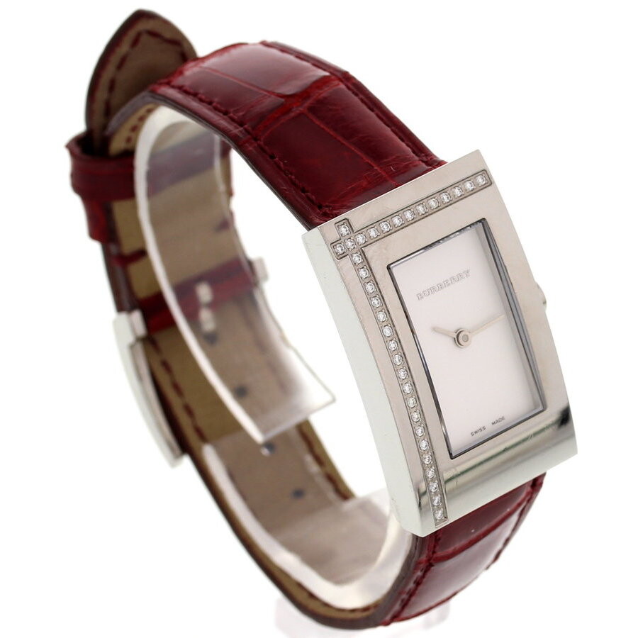 Silver-tone stainless steel case with a silver-tone stainless steel bracelet. Fixed silver-tone diamond set bezel. White dial with silver-tone hands. Dial Type: Analog. Quartz movement. Scratch resistant sapphire crystal. Pull / push crown. Solid case back. Rectangle case shape. Case size: 21 mm. Buckle clasp. Water resistant at 30 meters / 100 feet. Functions: hour, minute. Luxury watch style. Watch label: Swiss Made. Pre-owned Burberry Quartz Diamond White Dial Ladies Watch BU5502.