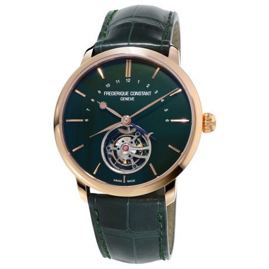 18kt rose gold case with a green alligator leather strap. Fixed 18kt rose gold bezel. Green dial with gold-tone leaf-style shape hands and index hour markers. Dial Type: Analog. One subdial displaying: tourbillon. Frederique Constant Calibre FC-980 Automatic movement, containing 33 Jewels, bitting at 28800 vph, and has a power reserve of approximately 48 hours. Scratch resistant sapphire crystal. See through case back. Round case shape, case size: 43 mm. Tang clasp. Water resistant at 30 meters / 100 feet. Functions: tourbillon, GMT, second time zone, hour, minute, day/night indicator. Manufacture Tourbillon Series. Luxury watch style. Watch label: Swiss Made. Item Variations: FC 980DG4S9, FC.980DG4S9, FC980DG4S9. Frederique Constant Manufacture Tourbillon Automatic Men's Watch FC-980DG4S9.