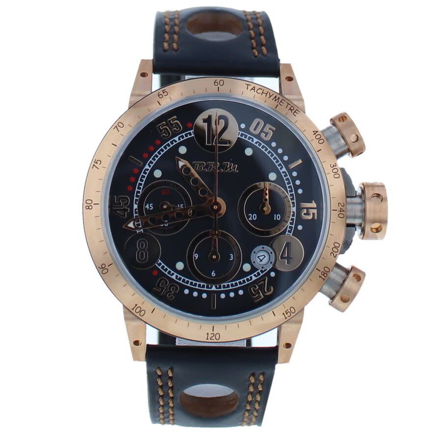 Stainless steel case with a leather strap. Fixed 18k rose gold bezel. Black dial with Arabic & index hour markers. Dial Type: Analog. Date display between 4 and 5 o'clock position. Automatic movement. Screw down crown. Transparent case back. Round case shape. Case size: 44 mm. Tang clasp. Functions: date, day, hour, minute, second. Sport watch style. Pre-owned B.R.M. V8-44 Automatic Black Dial Men's Watch V8-44-GT-5N-CN.