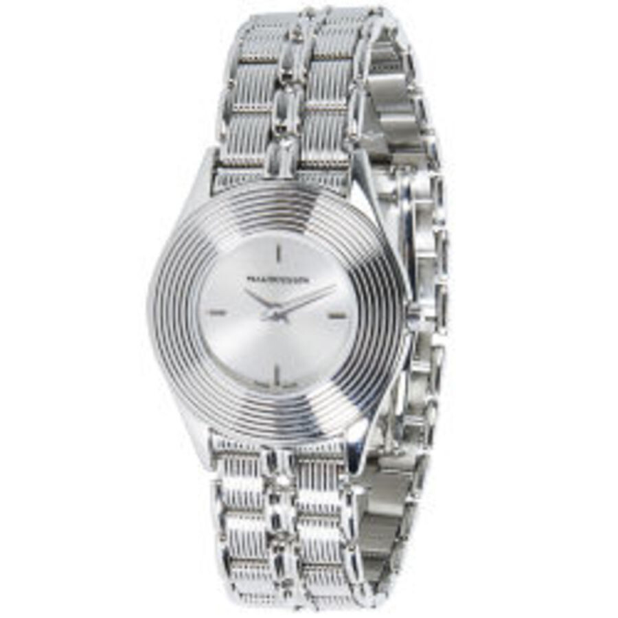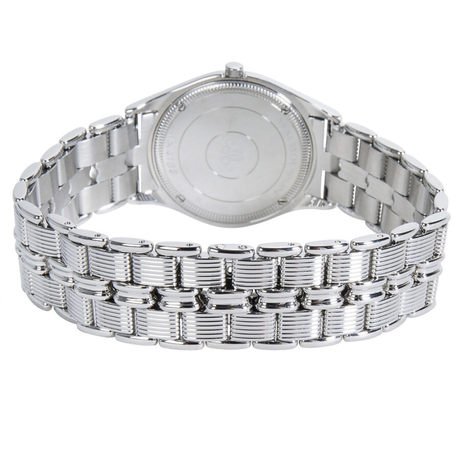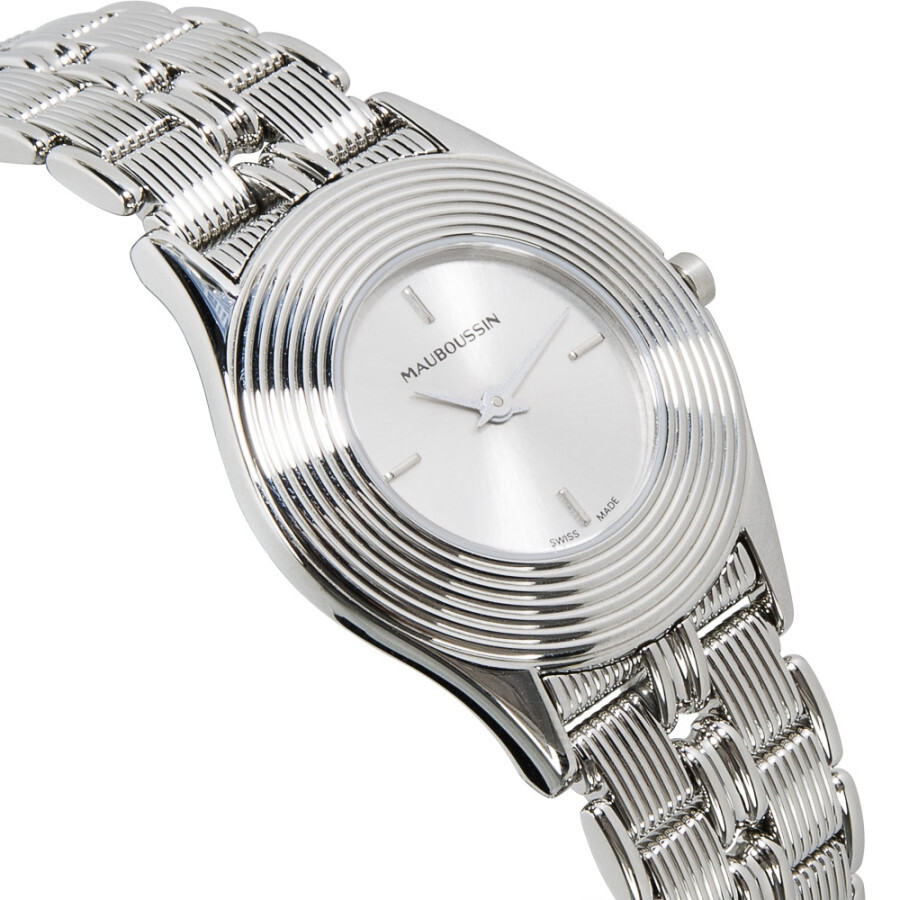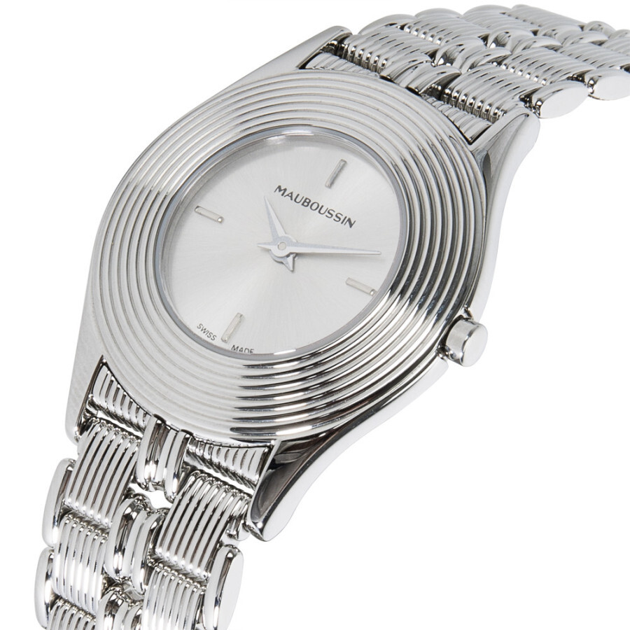 Silver-tone stainless steel case with a silver-tone stainless steel bracelet. Fixed silver-tone stainless steel bezel. Silver-tone dial with silver-tone hands and index hour markers. Dial Type: Analog. Quartz movement. Scratch resistant sapphire crystal. Pull / push crown. Solid case back. Round case shape, case size: 25 mm, case thickness: 4 mm. Band length: 6.50 inches. Hidden clasp. Water resistant at 30 meters / 100 feet. Functions: hour, minute. Dress watch style. Watch label: Swiss Made. Pre-owned Mauboussin None Quartz Silver Dial Ladies Watch R.62682.