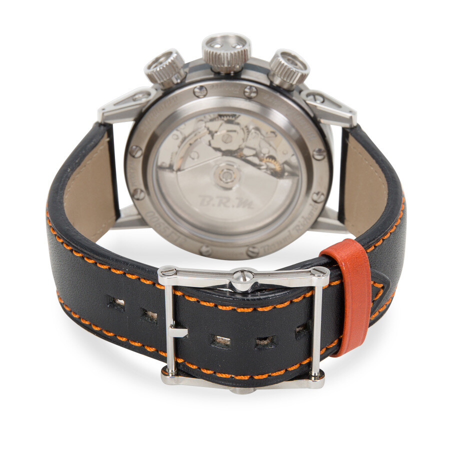 Black titanium case with a black leather strap. Fixed black titanium bezel. Black dial with orange hands and Arabic numeral hour markers. Minute markers around the outer rim. Dial Type: Analog. Date display between 4 and 5 o'clock position. Chronograph - three sub-dials displaying: 60 seconds, 30 minutes, 12 hours. Automatic movement. Scratch resistant sapphire crystal. Pull / push crown. Transparent case back. Round case shape, case size: 44 mm, case thickness: 14 mm. Band width: 22 mm, band length: 8.5 inches. Tang clasp. Functions: date, hour, minute, second. Sport watch style. Pre-owned B.R.M. V14 Automatic Black Dial Men's Watch V14-44-BG-CAO-AO.