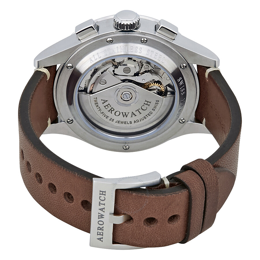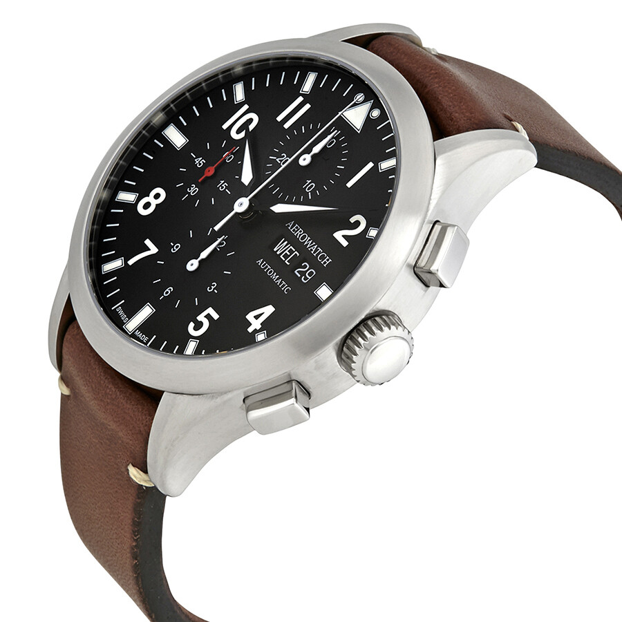 Sstainless steel case with a dark brown leather strap. Fixed stainless steel bezel. Black dial with luminous black hands and Arabic numeral hour markers. Minute markers around the outer rim. Dial Type: Analog. Luminescent hands and markers. Day of the week and date display at the 3 o'clock position. Chronograph - three sub-dials displaying: 0 second, 30 minute and 12 hours. ETA-Valjoux caliber 7750 automatic movement with a 44-hour power reserve. Scratch resistant sapphire crystal. Transparent case back. Case size: 42 mm. Case thickness: 15.44 mm. Round case shape. Band width: 20 mm. Tang clasp. Water resistant at 50 meters / 165 feet. Functions: chronograph, date, day of the week, hour, minute, second. Dress watch style. Watch label: Swiss Made. Aerowatch The Grand Classics Pilot Automatic Chronograph Men's Watch A 61968 AA03.