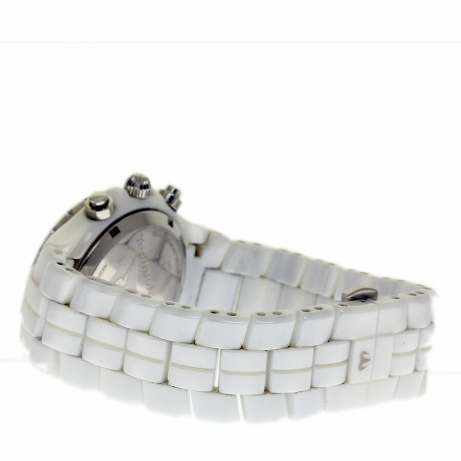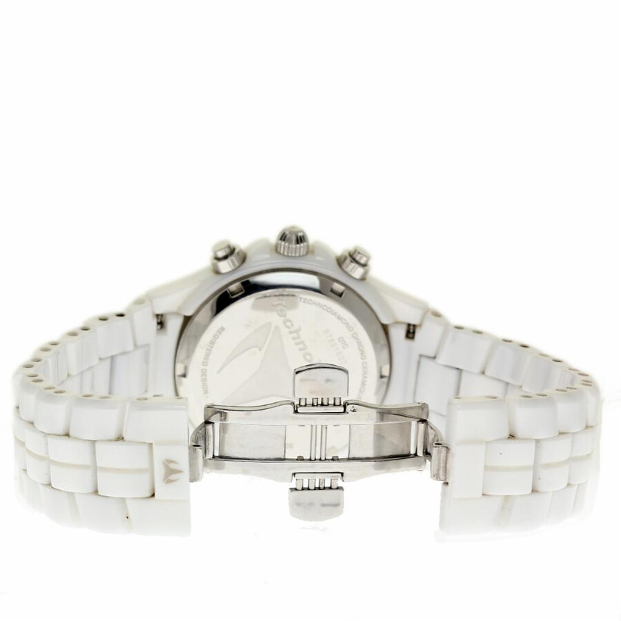 White ceramic case with a white ceramic bracelet. Uni-directional rotating silver-tone 106 diamond set bezel. Silver-tone dial with silver-tone hands and Arabic numeral hour markers. Minute markers around the outer rim. Dial Type: Analog. Luminescent hands. Date display at the 4 o'clock position. Chronograph - three sub-dials displaying: 60 second, 30 minute and 1/10th of a second. ETA Caliber G10.711 quartz movement. Scratch resistant sapphire crystal. Screw down crown. Solid case back. Round case shape. Case size: 40 mm. Band length: 7.25 inches. Deployment clasp. Water resistant at 200 meters / 660 feet. Functions: chronograph, rattrapante, date, hour, minute, small second. Dress watch style. Watch label: Swiss Made. Pre-owned Technomarine Technodiamond Chronograph Silver Dial Ladies Watch DTC55C.