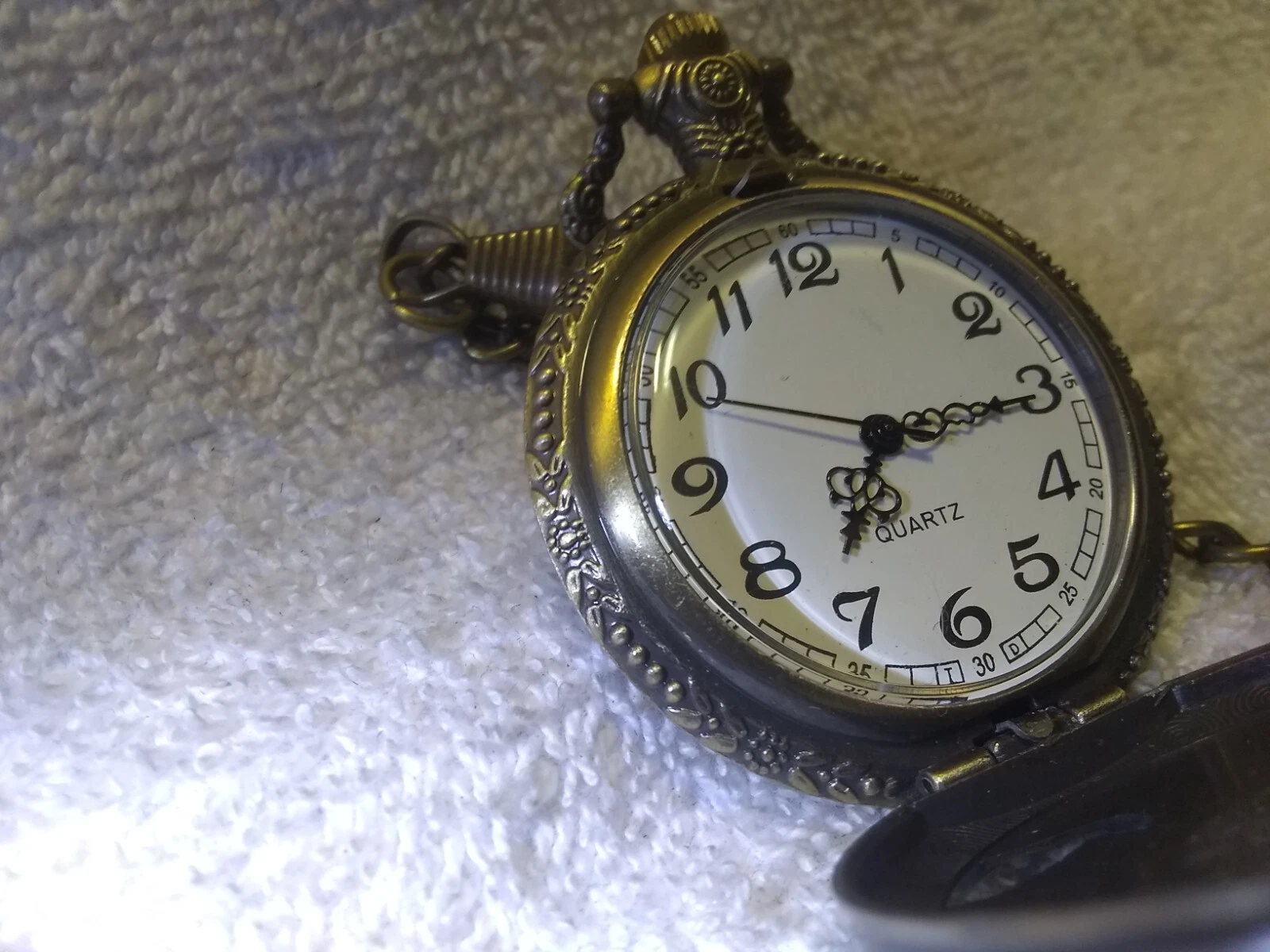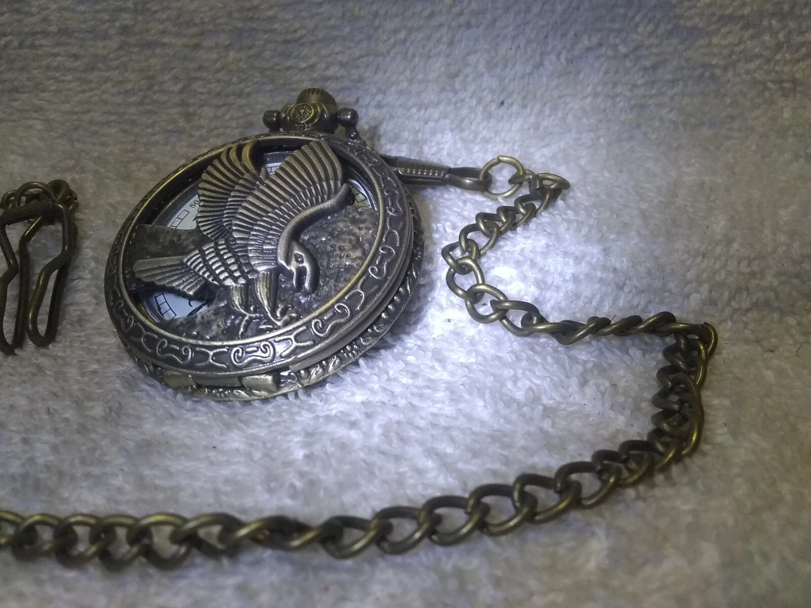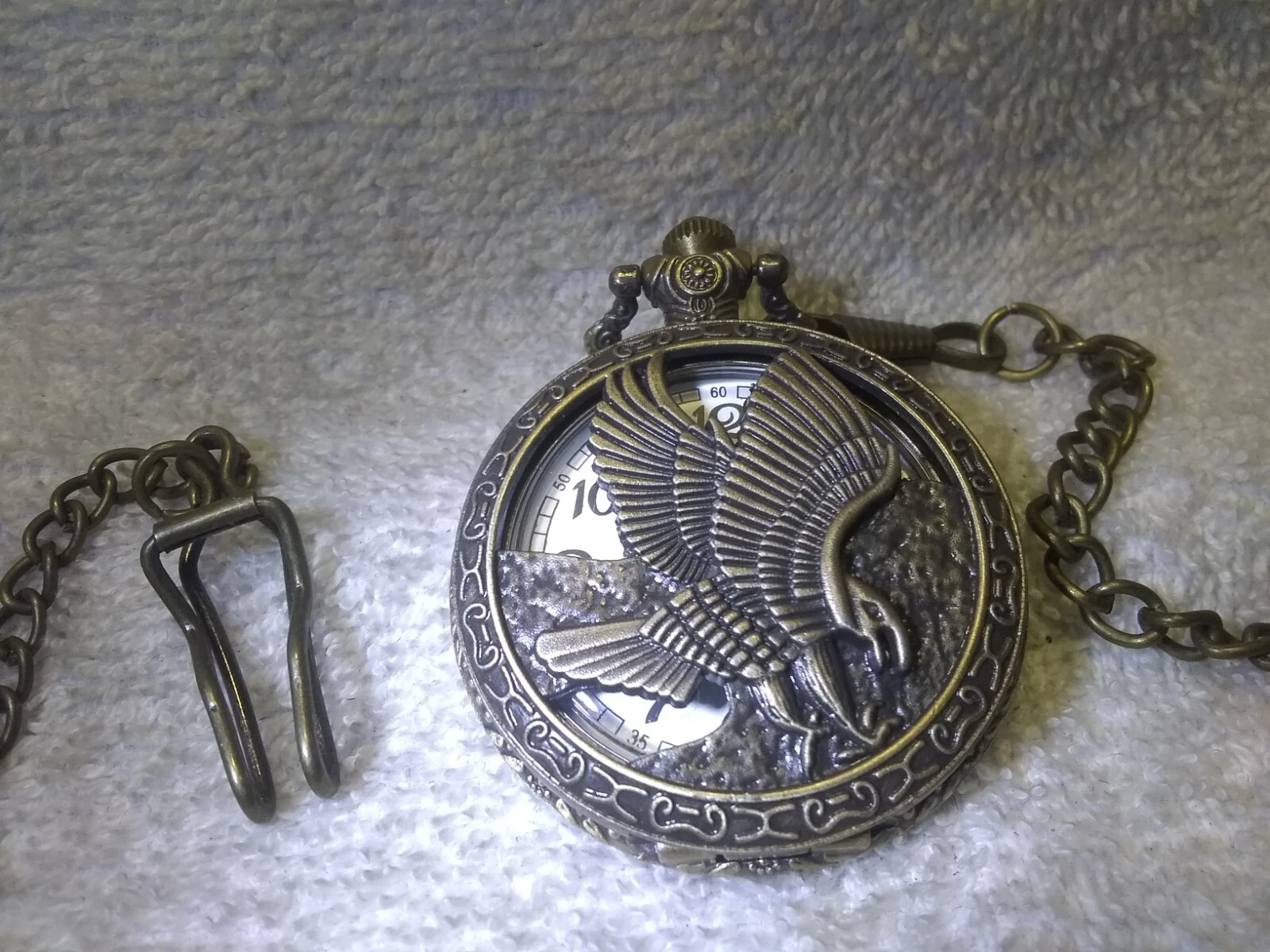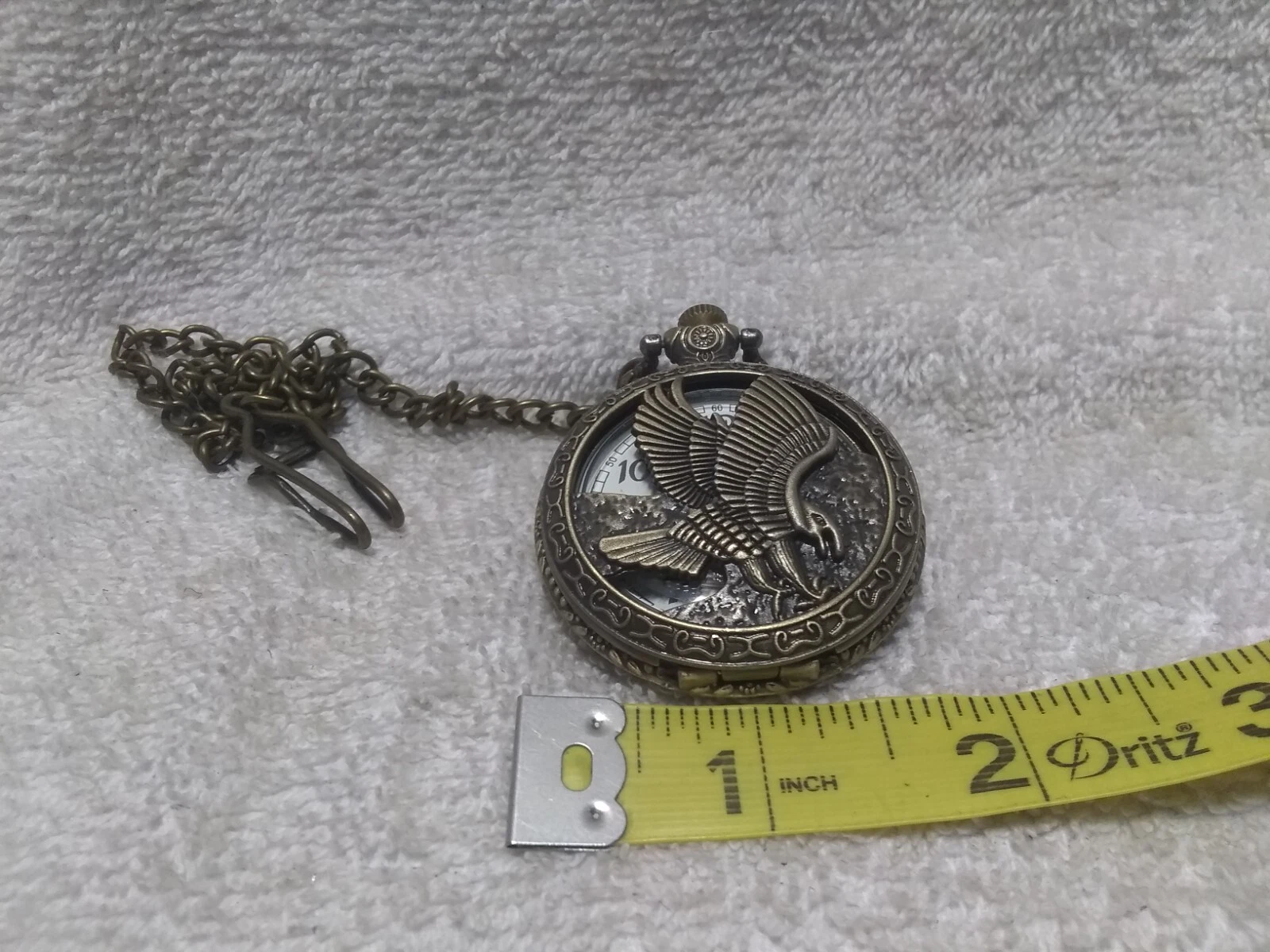 See Through Bald Eagle Gold Engraved Pocket Watch White Dial New Bat Works Great