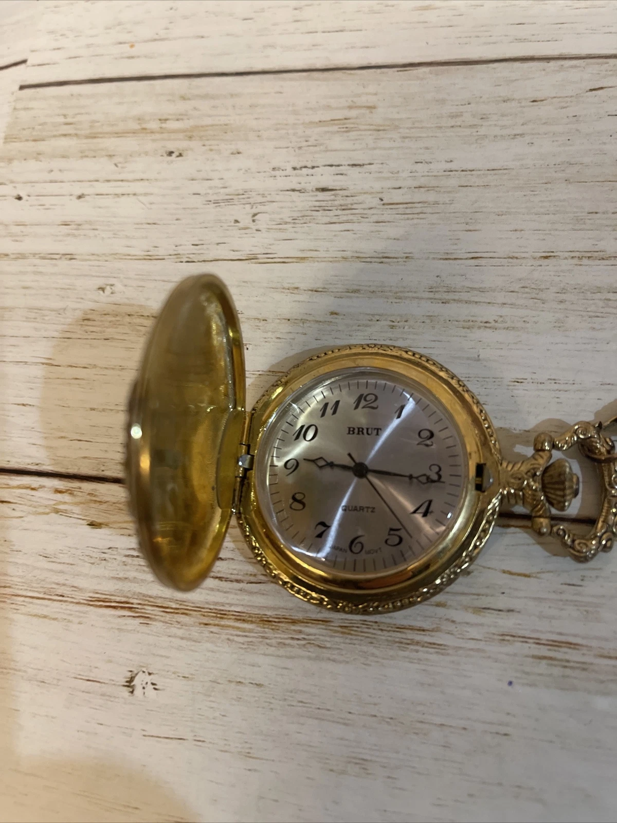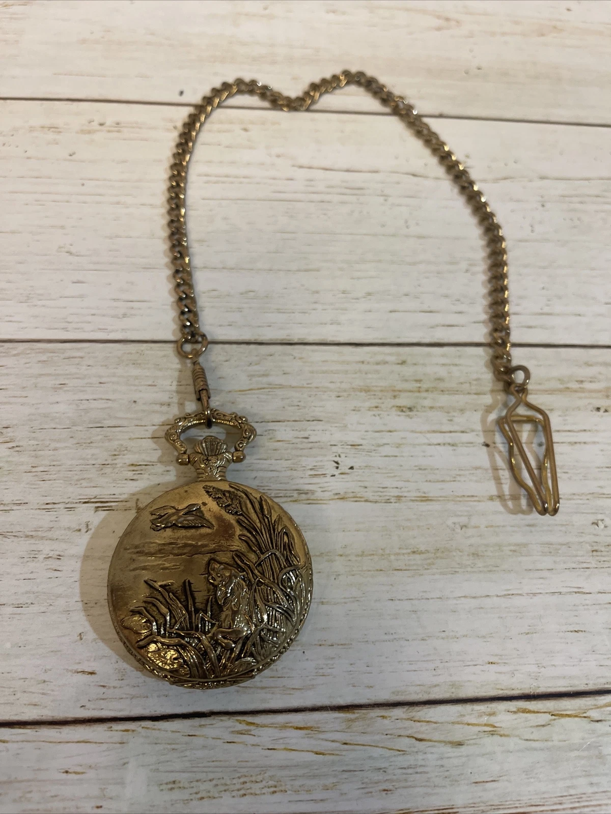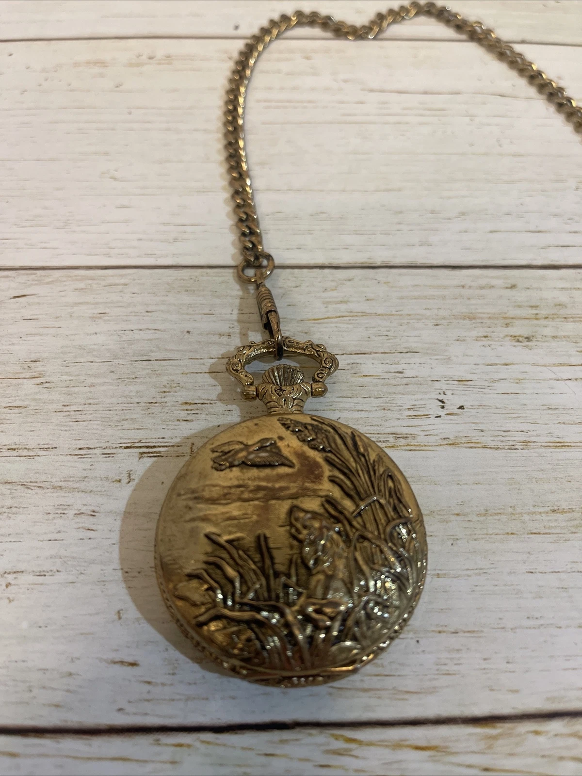 Vintage BRUT Quartz Duck Hunter Gold Color Men's Pocket Watch Bird Dog Chain
