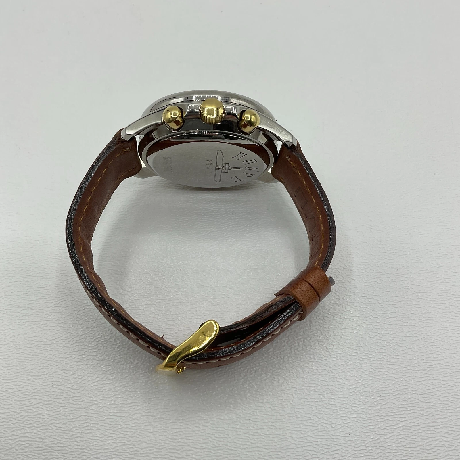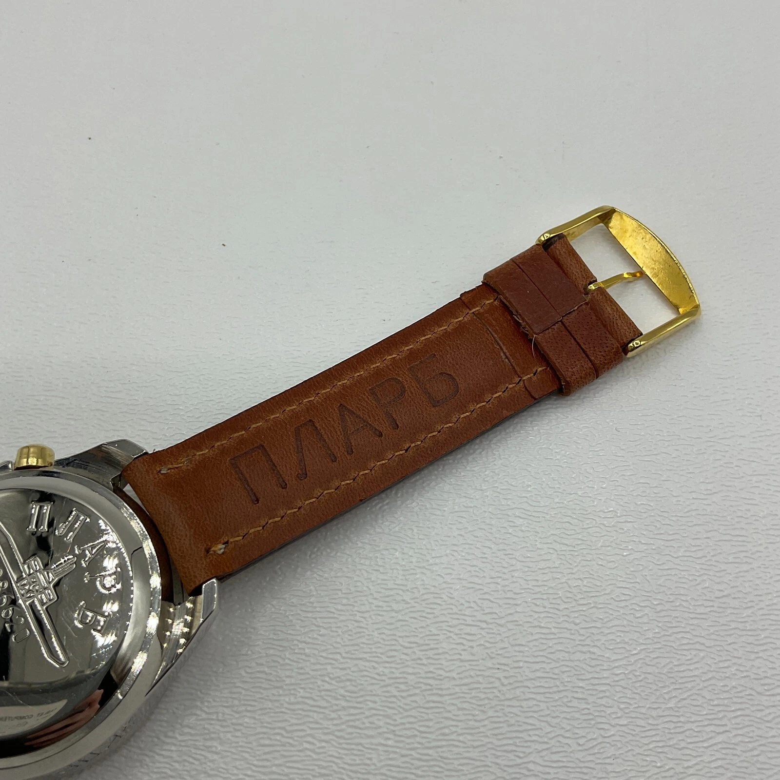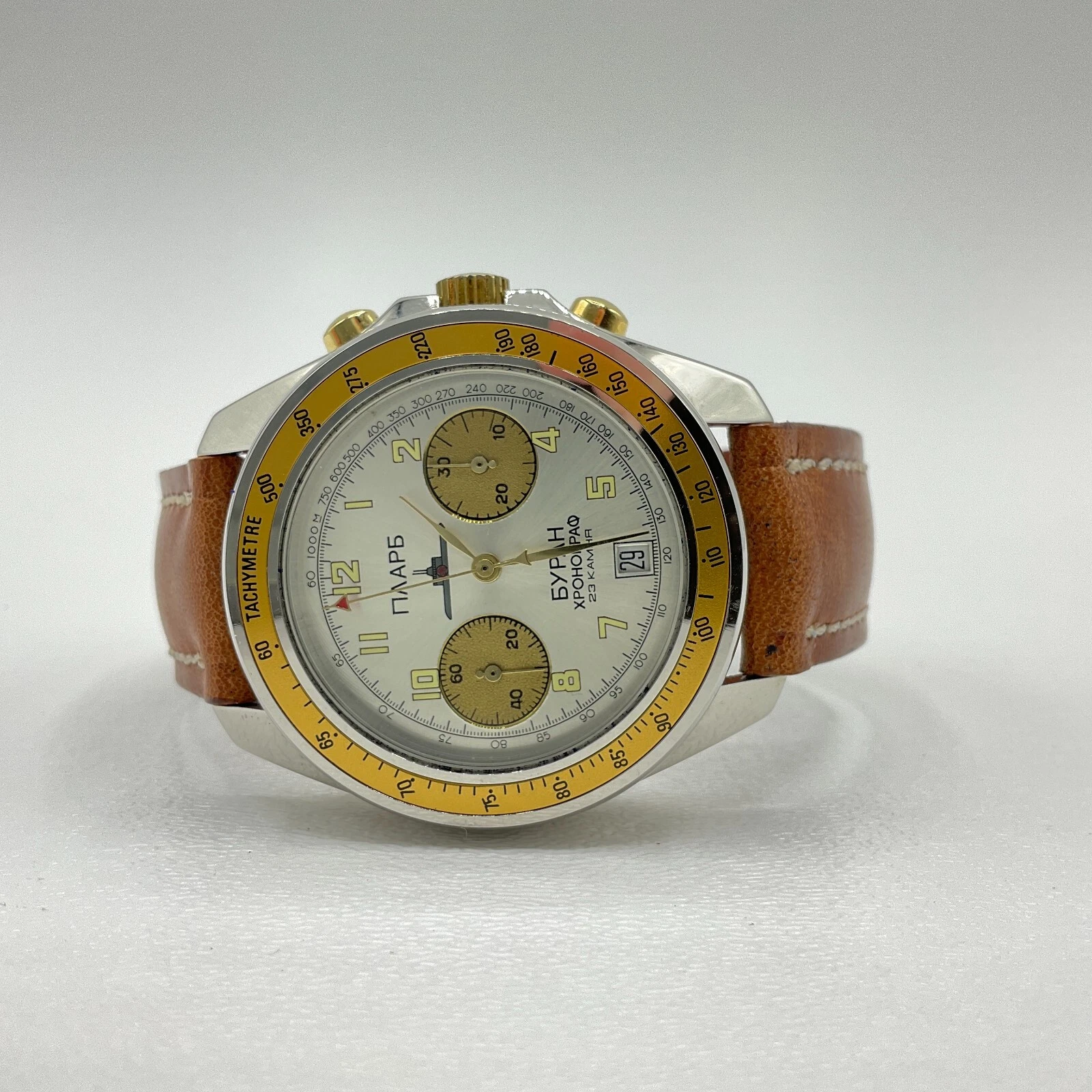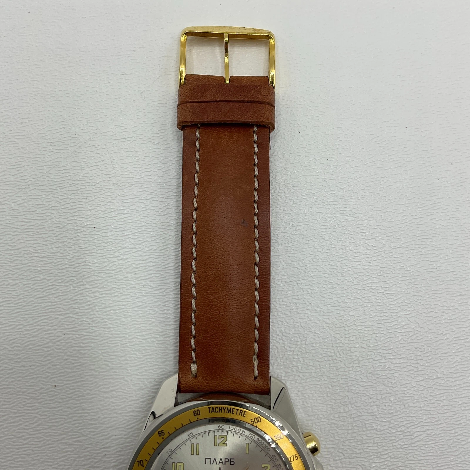 Buran Plarb Chronograph Russian Mens 39mm Watch Silver Dial Brown Leather Band