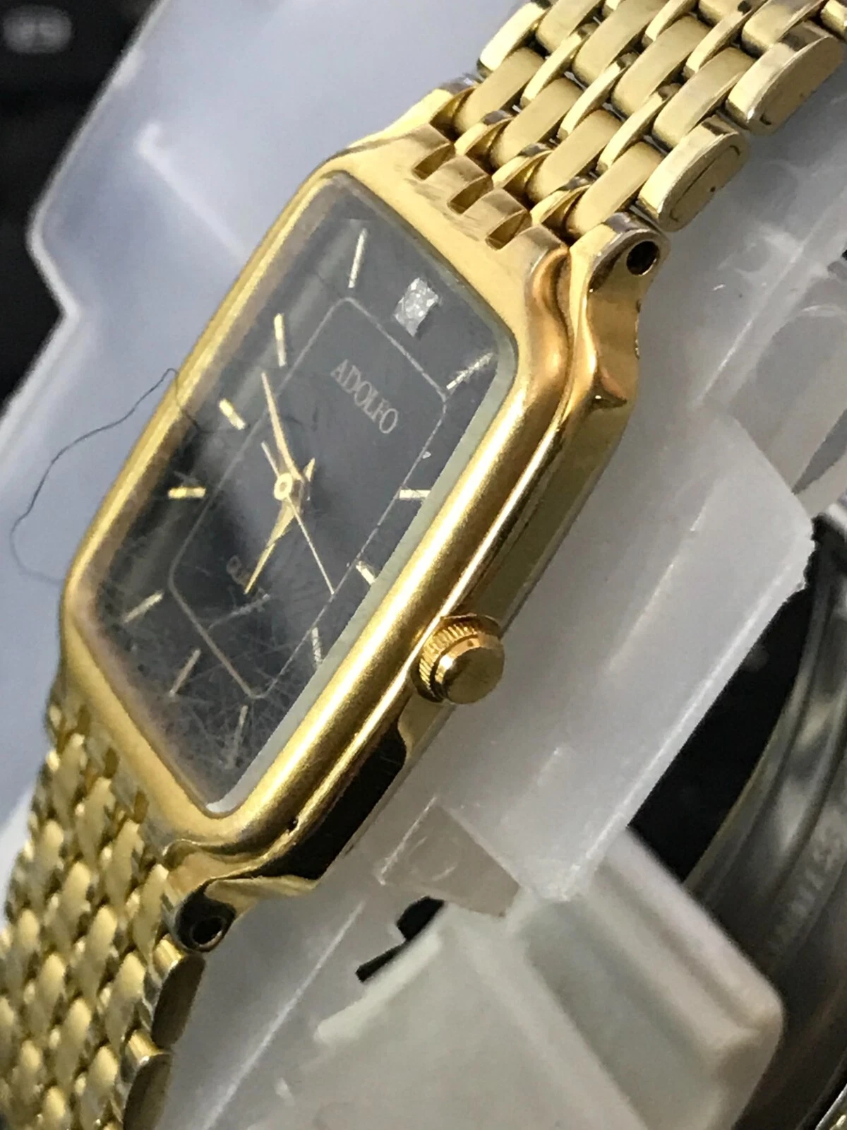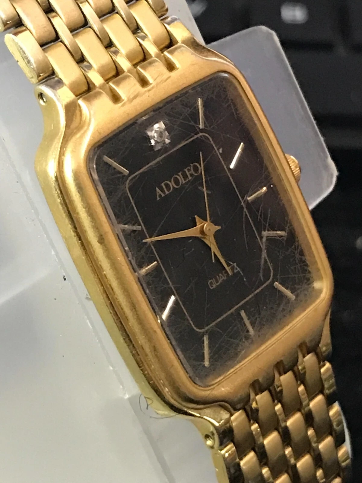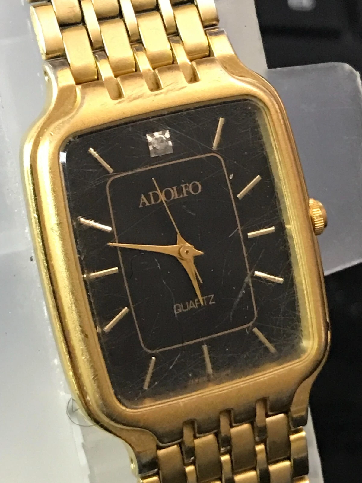 ADOLFO Diamond 25mm Black Dial Golden Tank Ladies Quartz Watch Run (Y87)