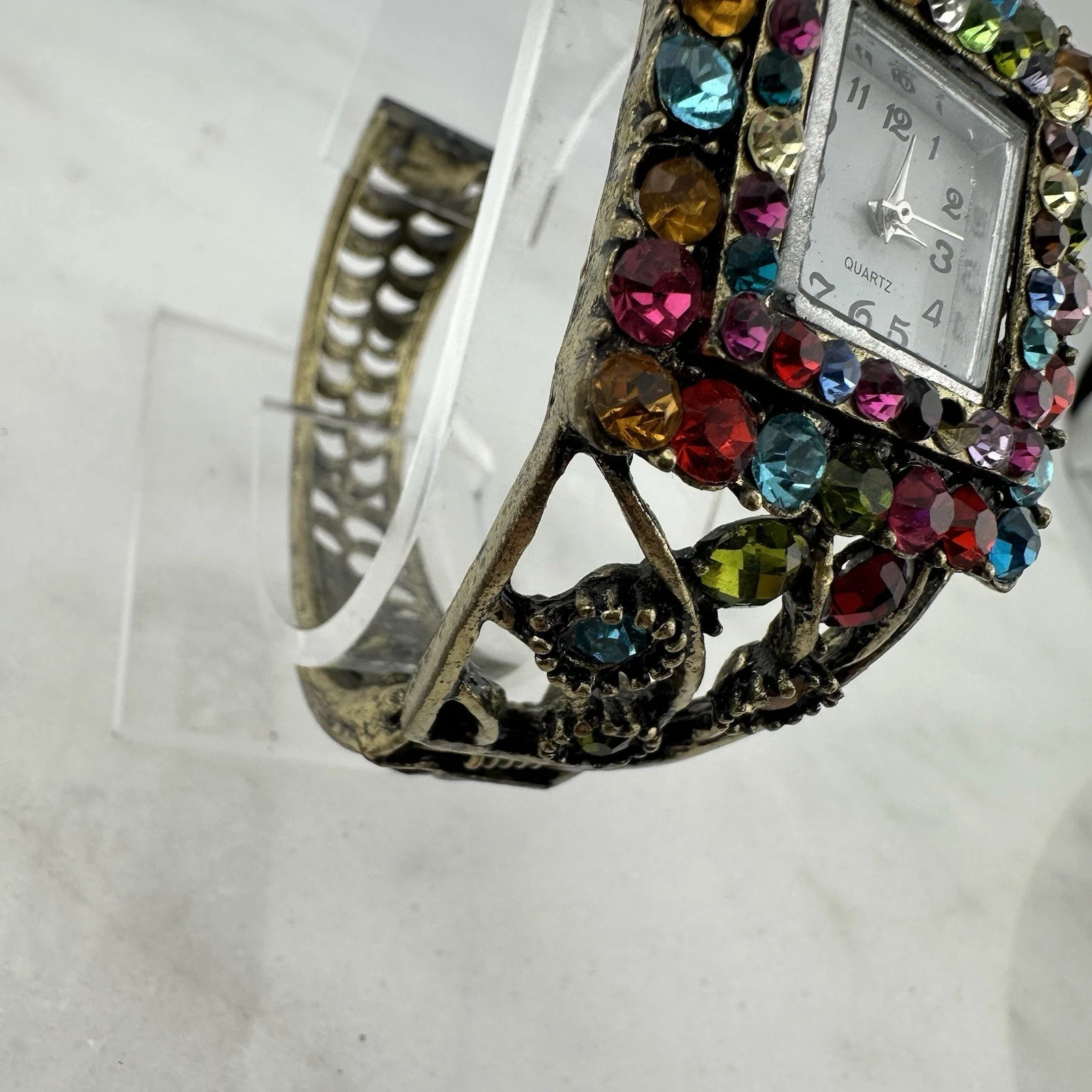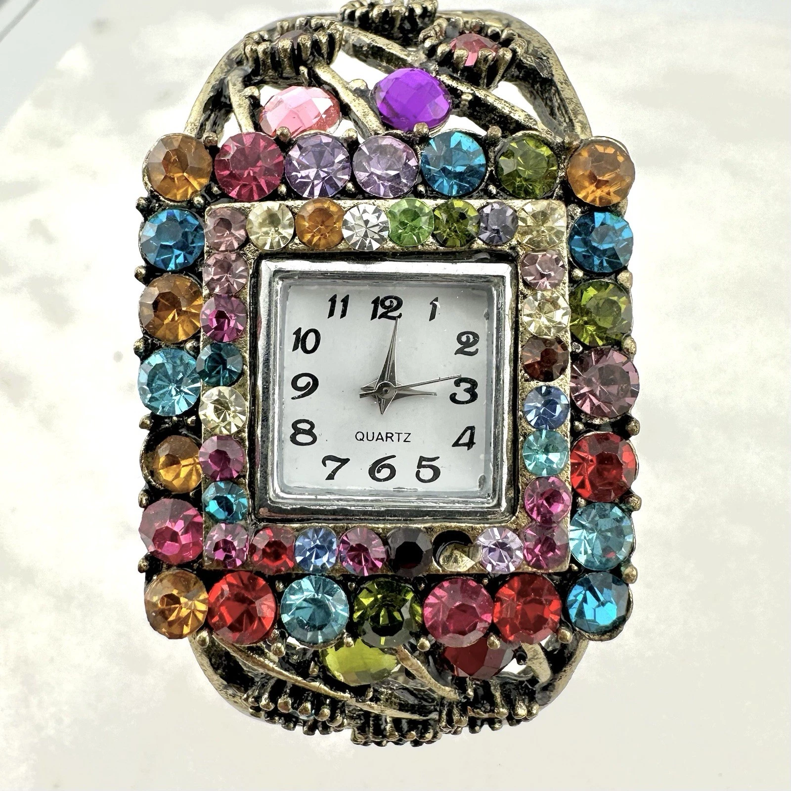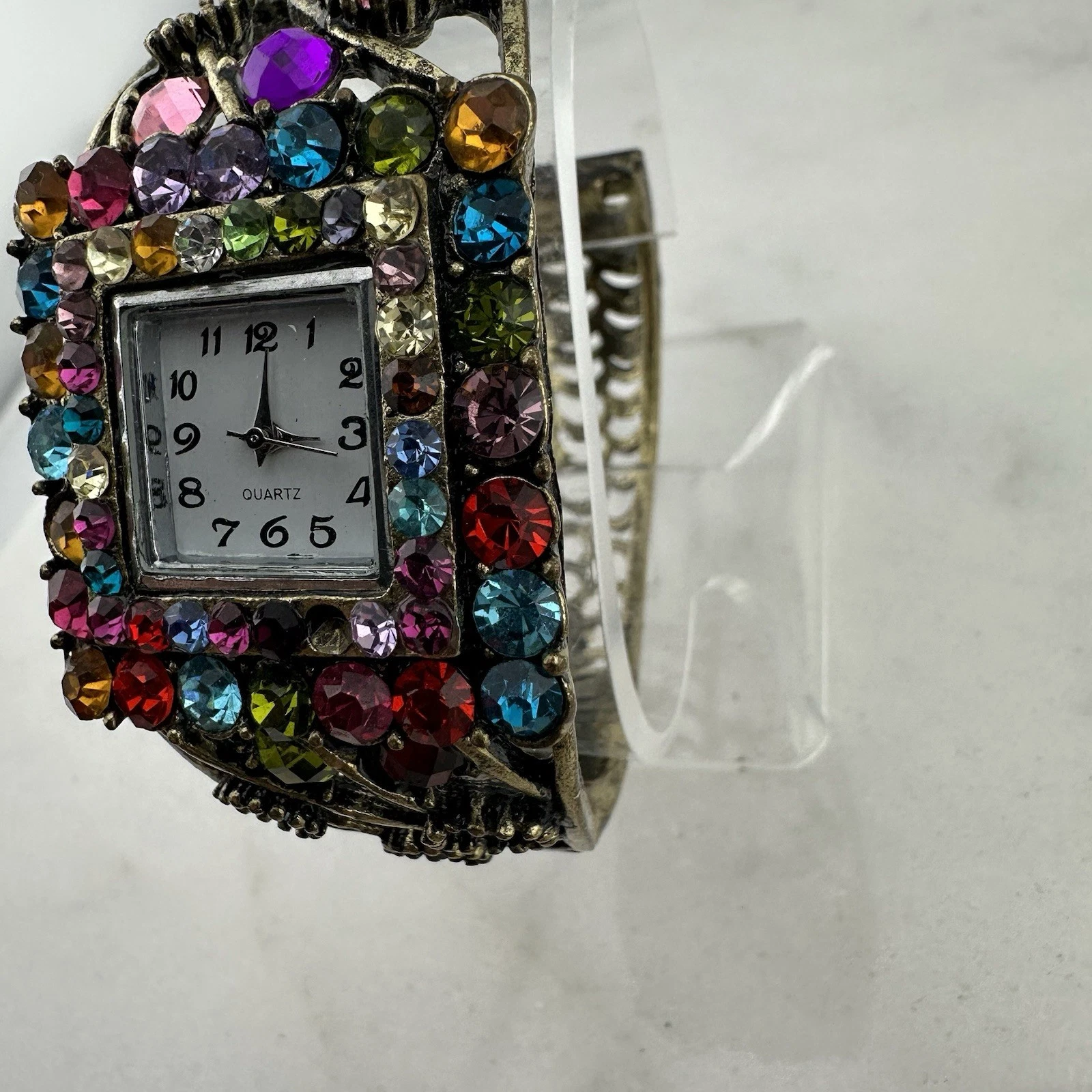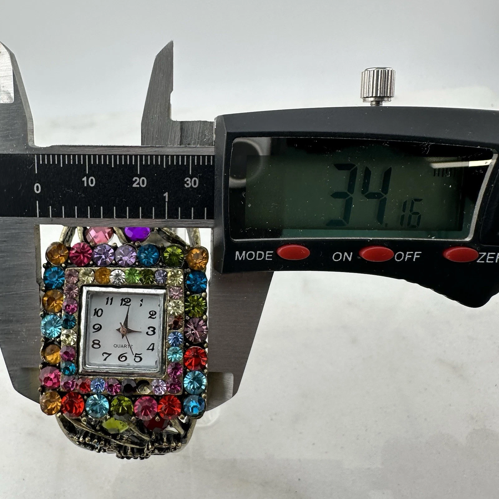 Women’s Watch Square Dial Rainbow Rhinestone Cuff Watch - New Battery Installed