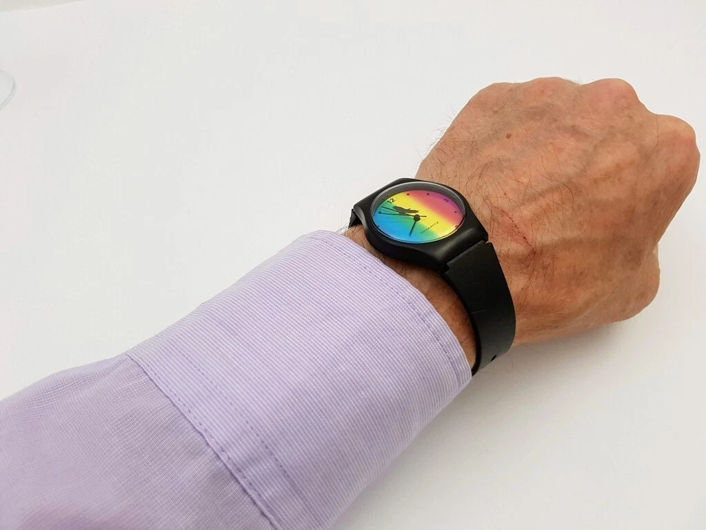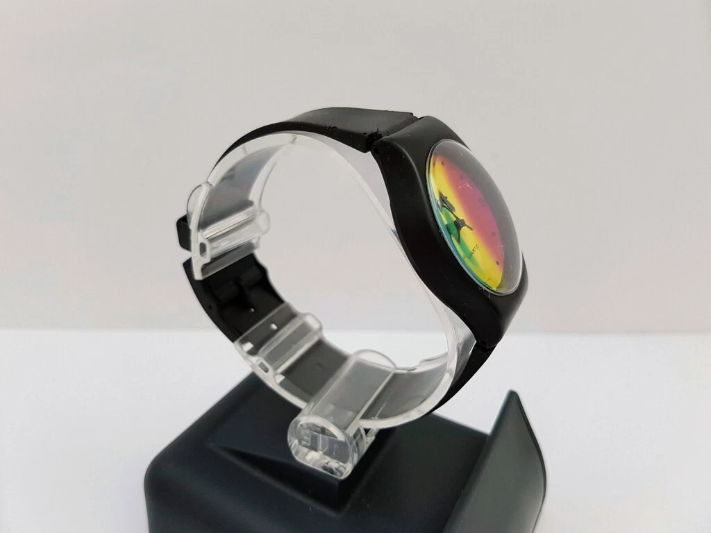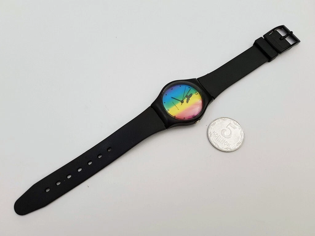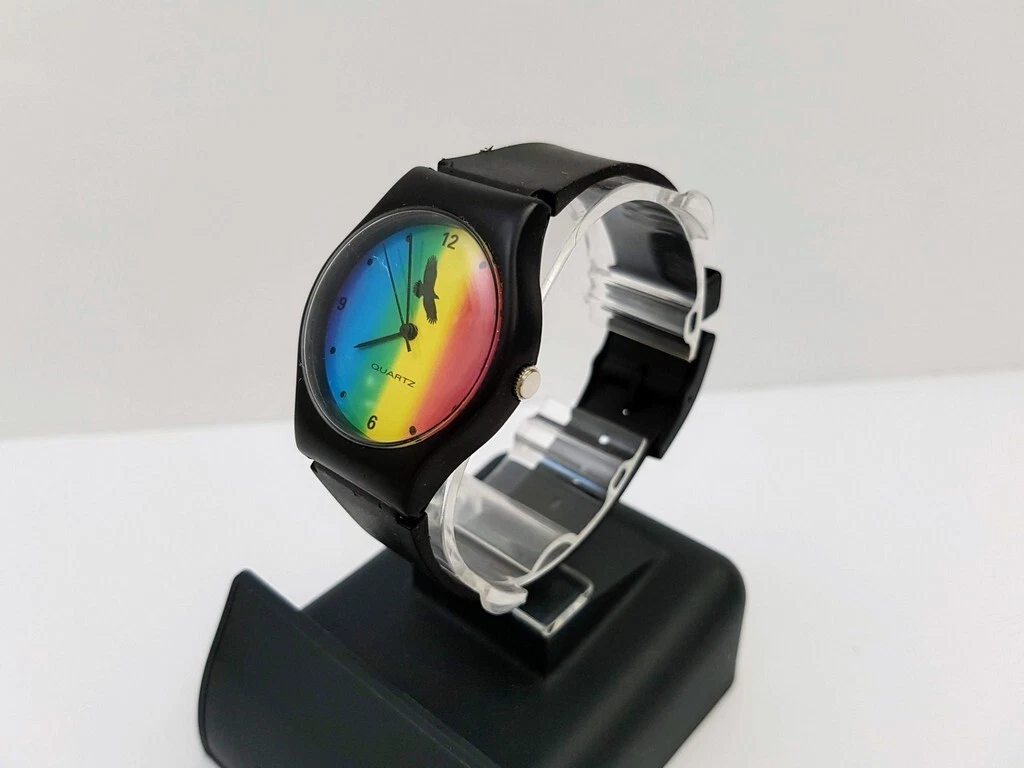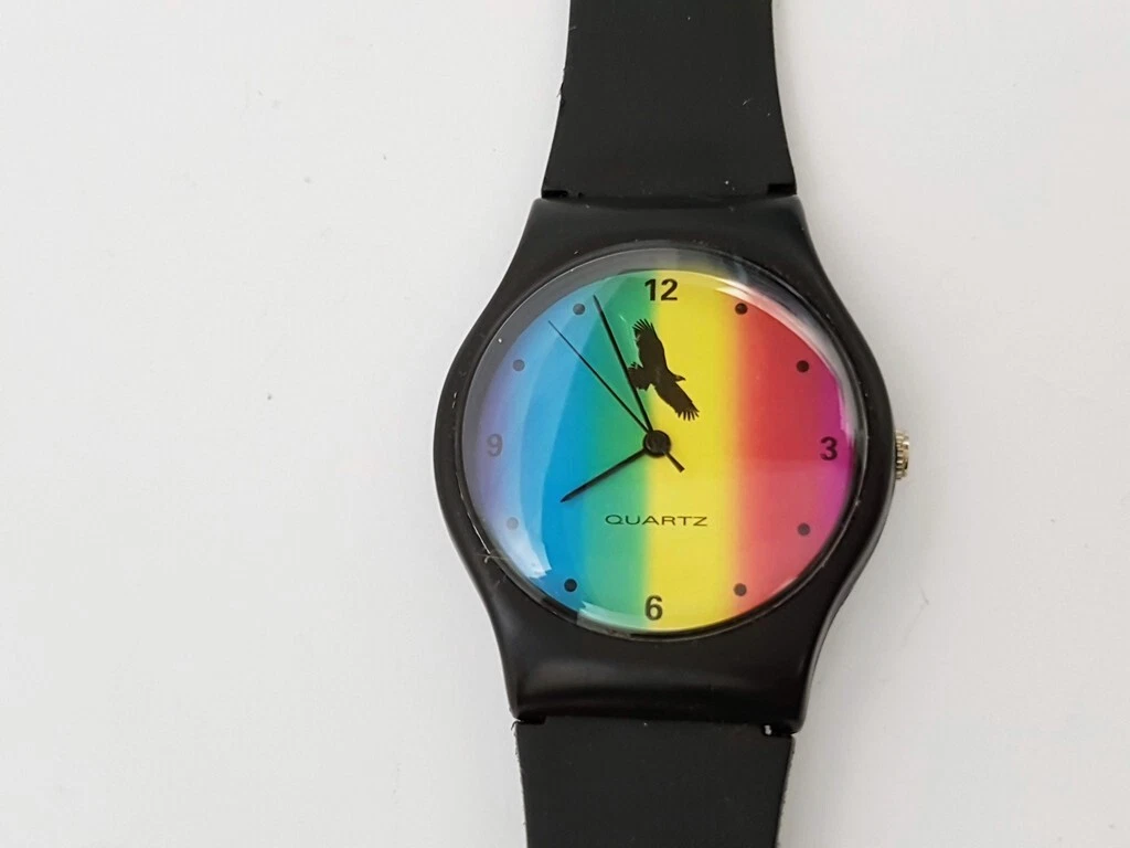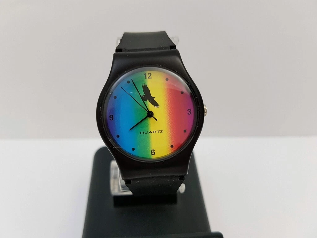 Beautiful lightweight plastic watch, quartz, eagle on a rainbow background.