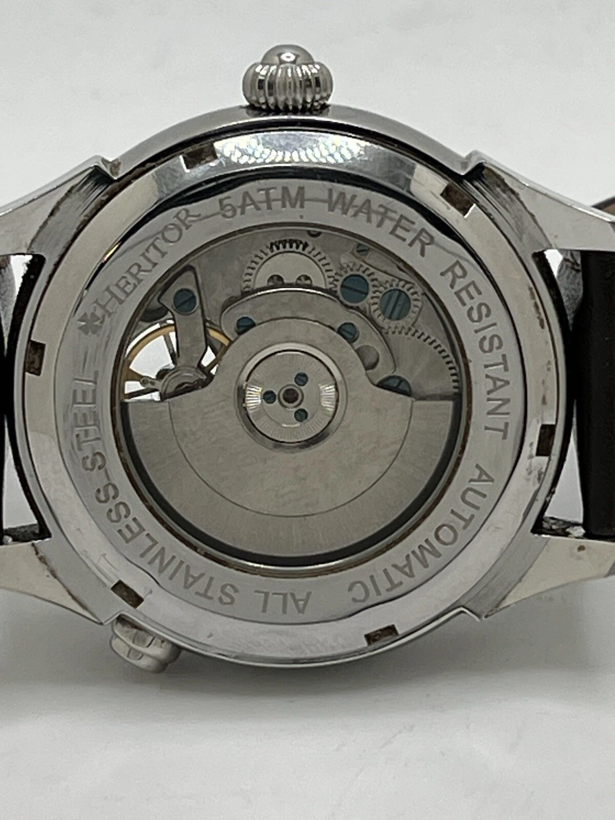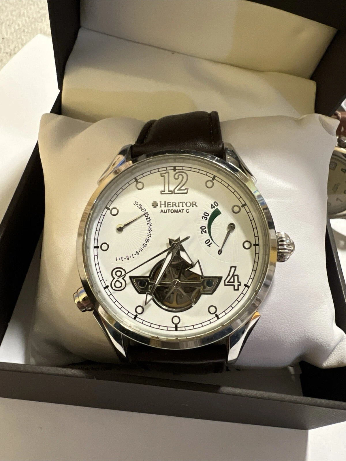 Heritor Automatic Semi-Skeleton Leather Watch w/Day/Date Leather Band In Box