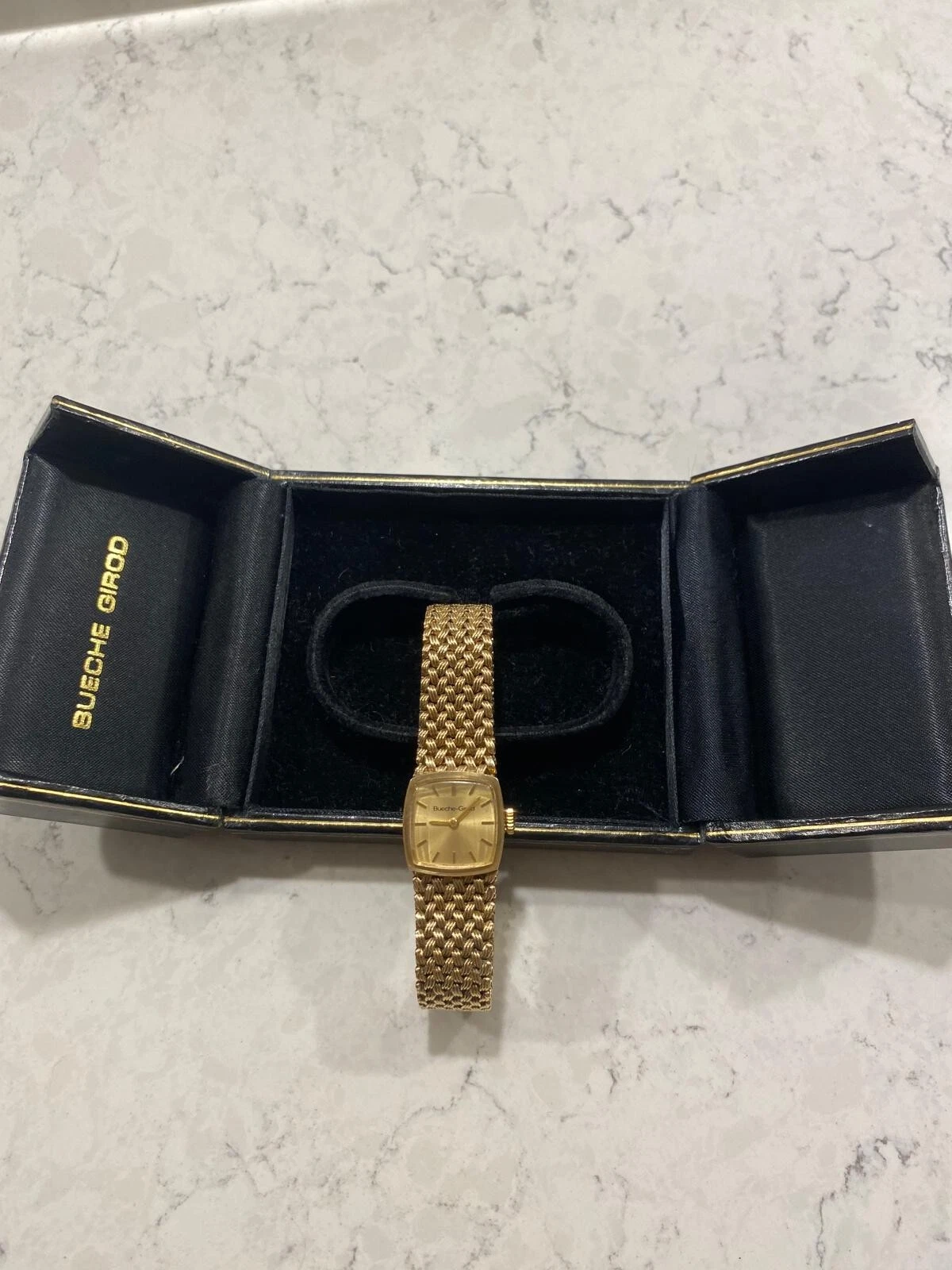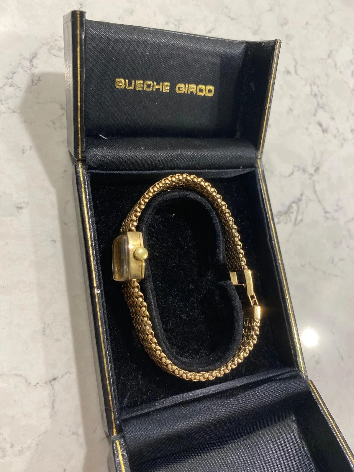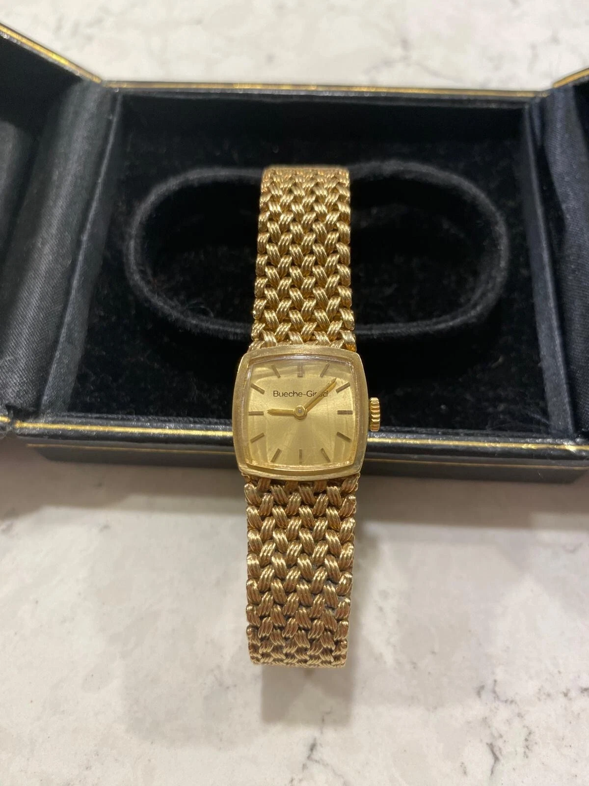 Vintage 1978 Bueche Girod 9ct gold watch integrated gold weave bracelet