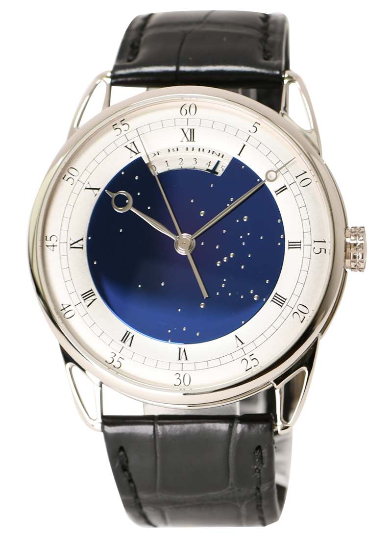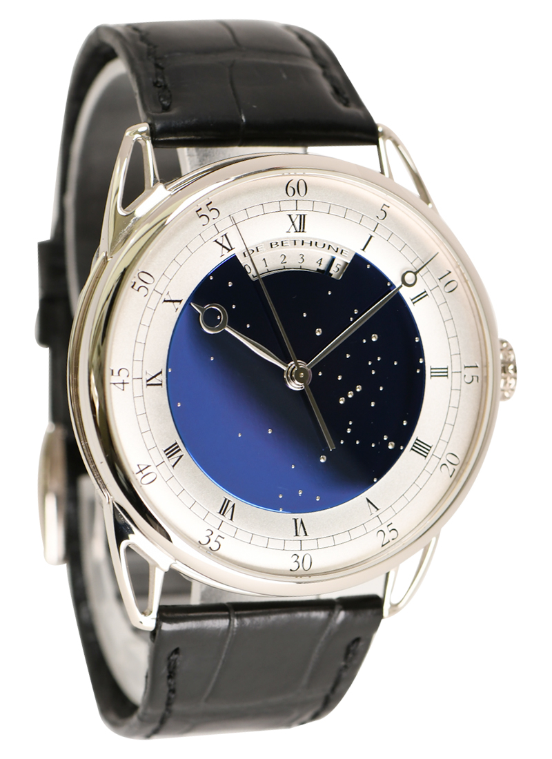 To true connoisseurs capable of understanding its passionate subtlety, De Bethune has rethought the tourbillon as a genuine wrist regulator, creating a major technical advance in the evolution of mechanical watches. The masterpiece, which is first revealed on the back of the watch, features a magnificent blued titanium dial, stamped with gold stars like a magical night sky. The silver hour and minute rings, which will be enhanced by the patina of time, evoke the most famous clocks of the 18th century. Limited edition of 20 pieces.