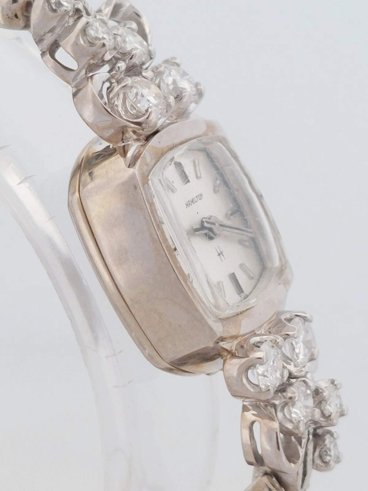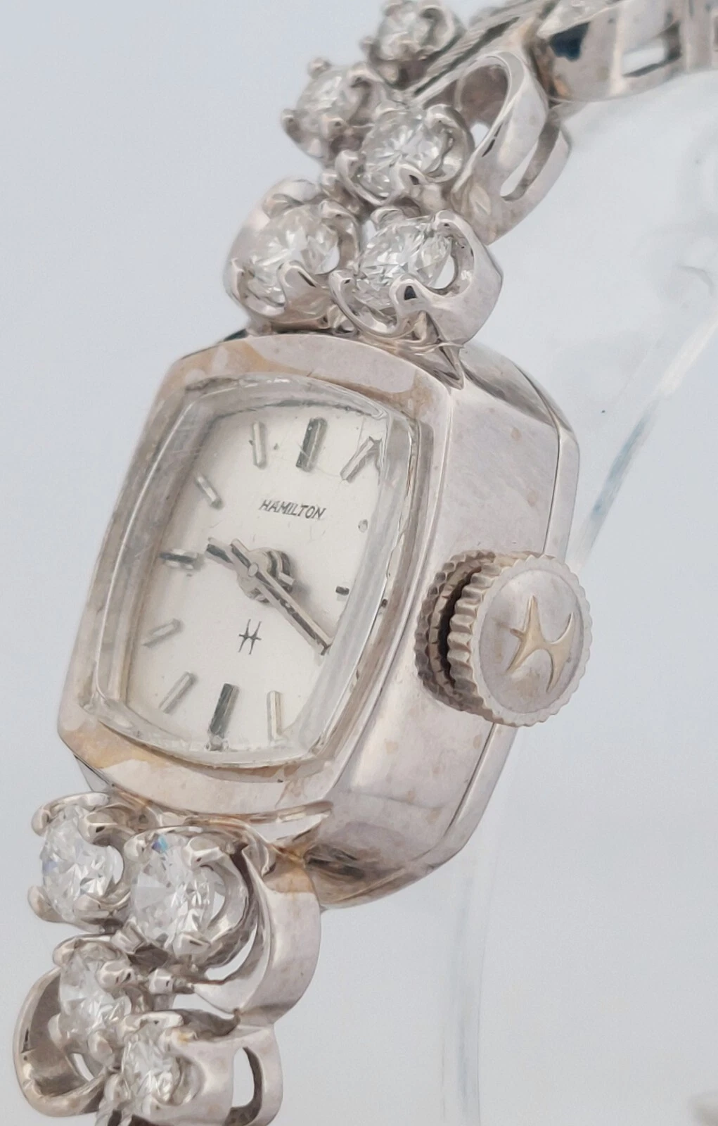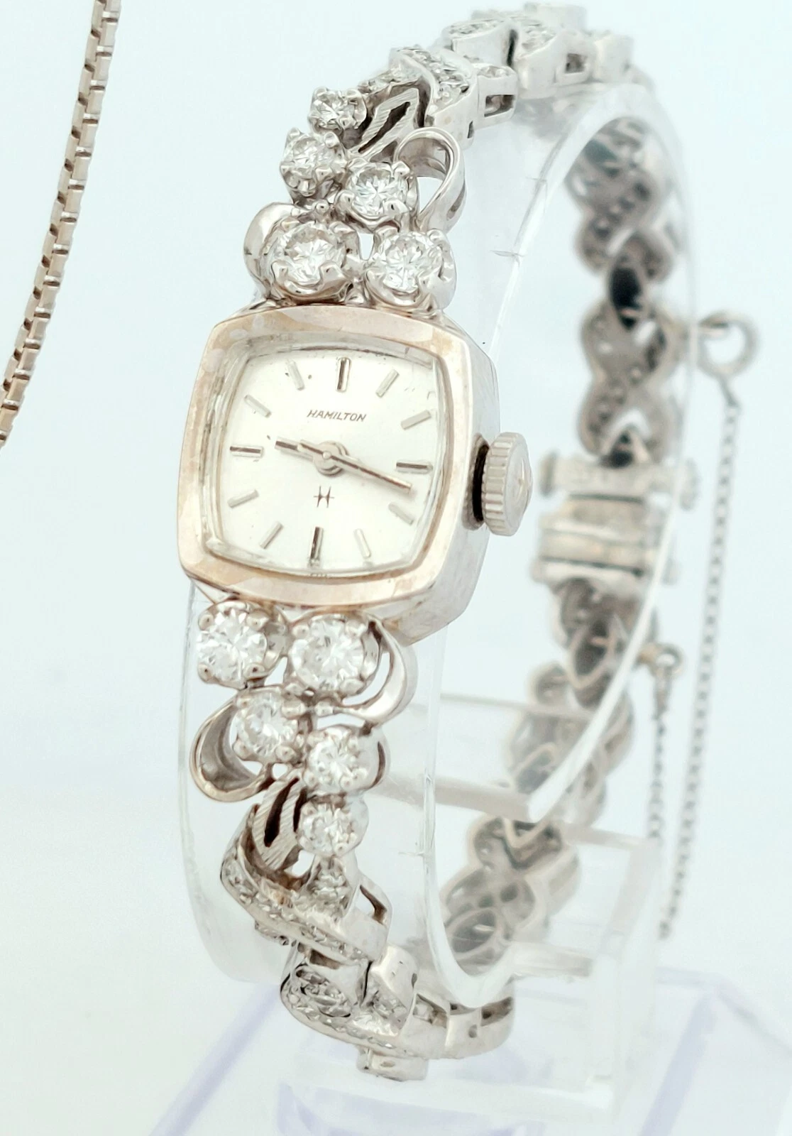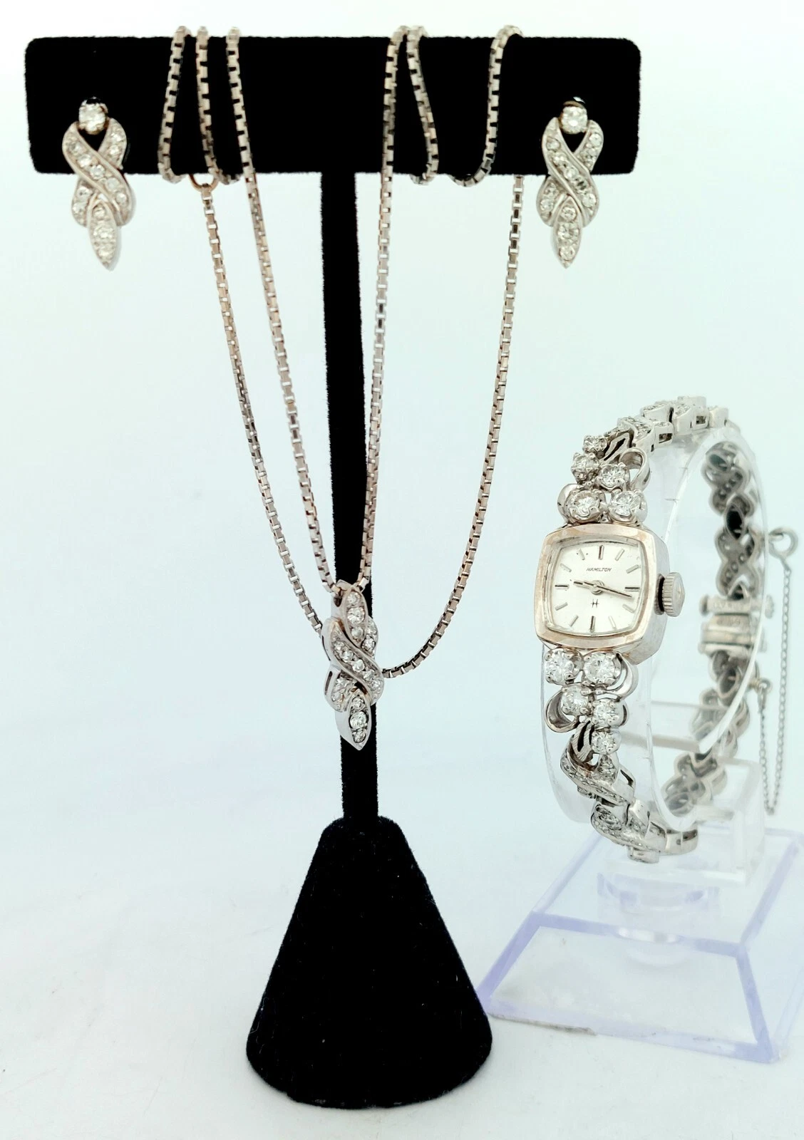14k White Gold Natural Diamond HAMILTON Ladies Watch 6¼", Necklace 17", Earrings