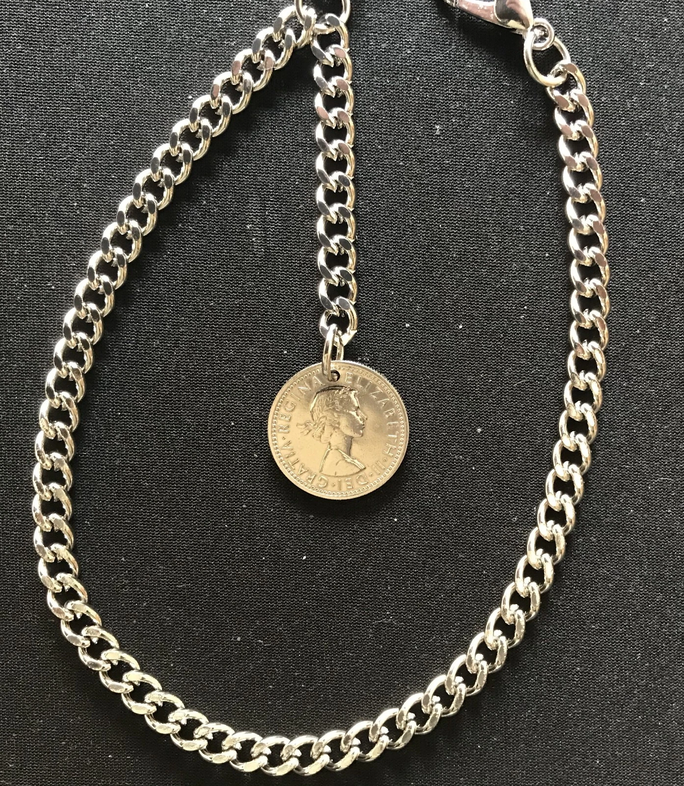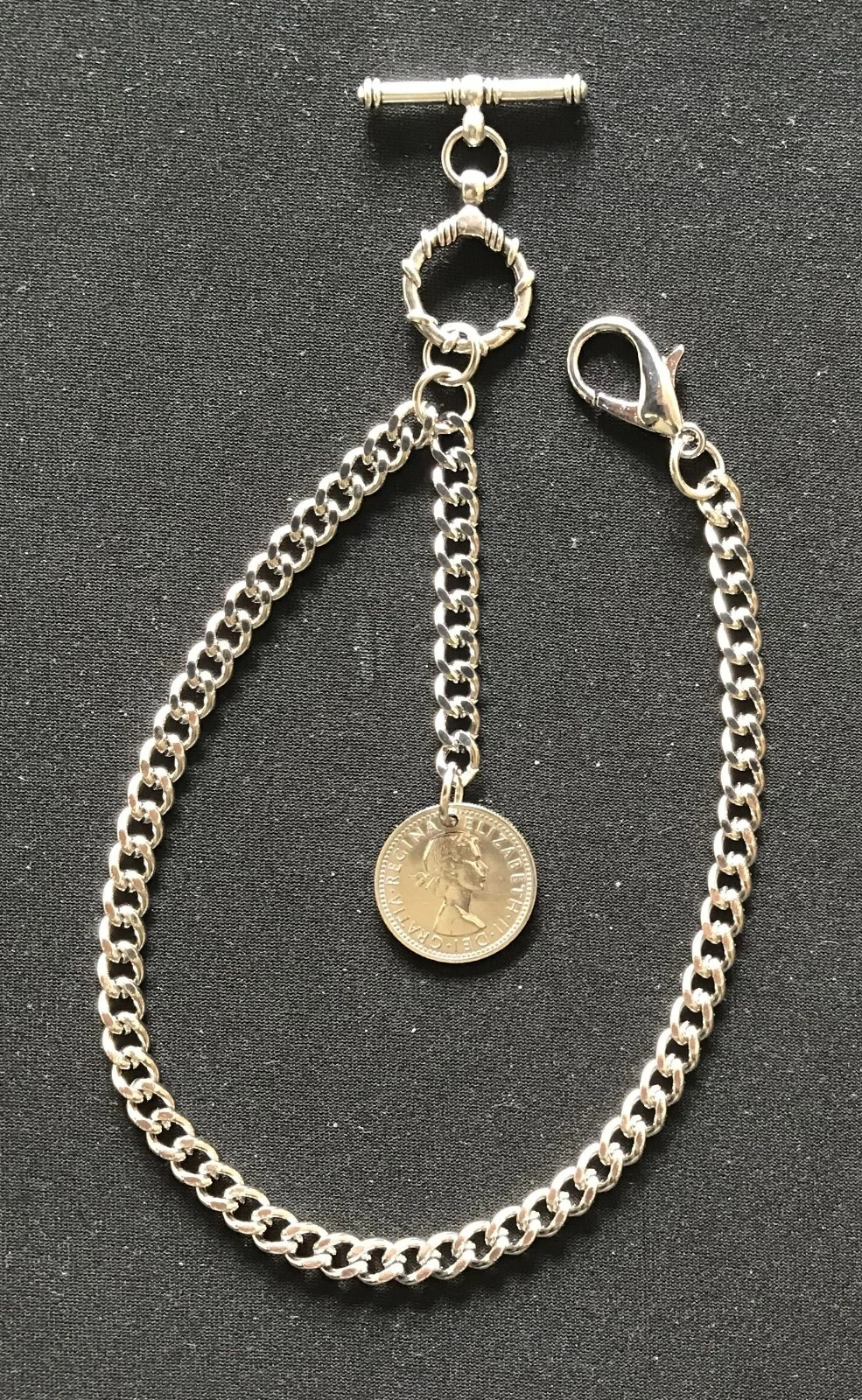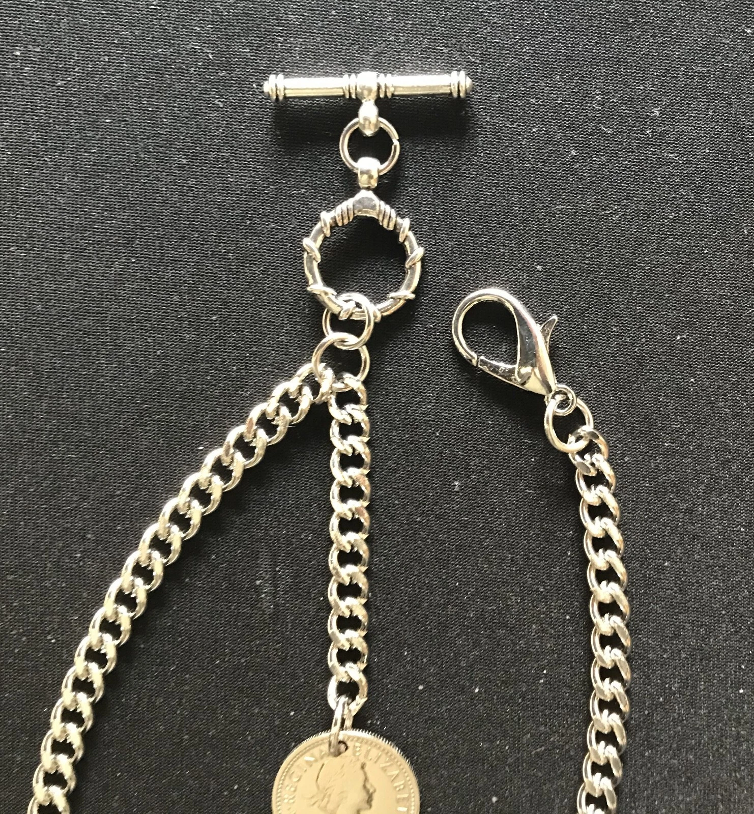 Albert pocket watch chain with a "Lucky"ER II sixpence fob,silver colour 4 sizes
